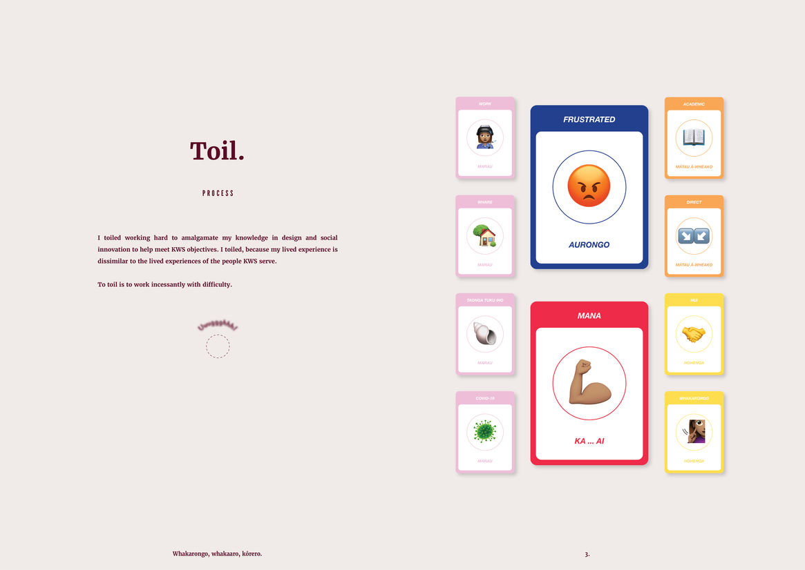 (3) But I toiled. I became frustrated because I wished to lift the mana of the people KWS serve. Despite academia in design and social innovation, my lived experience was dissimilar to the people I was designing with. I did not fully understand their work or how they lived, what was precious or the effect of covid 19 on their lives. After much toil, I realised that if I designed to facilitate kōrero, we might better understand each other and ourselves.