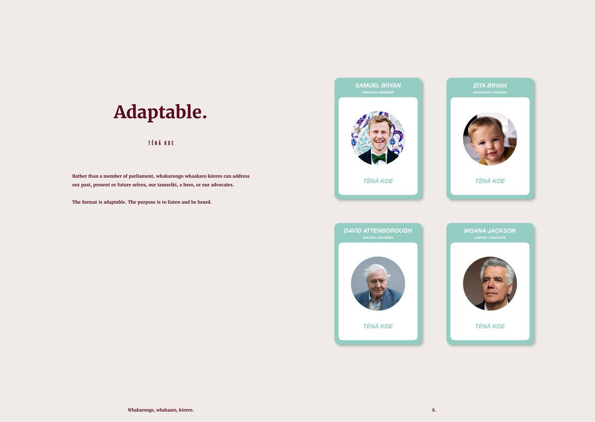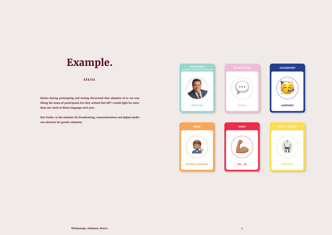 (7) Maori language week was a prevalent subject while prototyping and testing. Participants celebrated adoption of te reo at work and in the media. It lifted their mana. But participants wished Aotearoa’s leadership would fight for greater everyday adoption of te reo. Whakarongo, whaakaro, kōrero opened that conversation up, distilling courses of action we might take as individuals and as a collective.