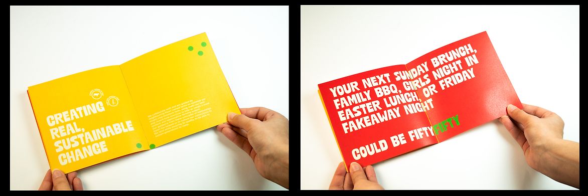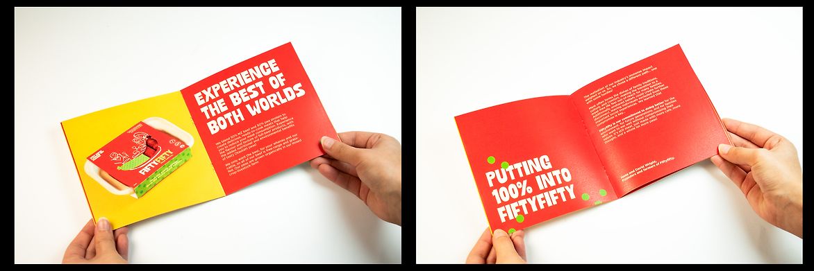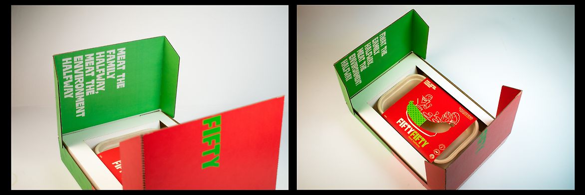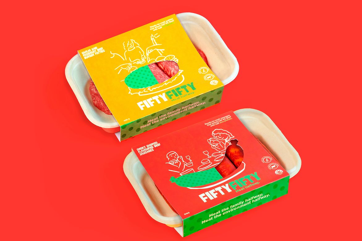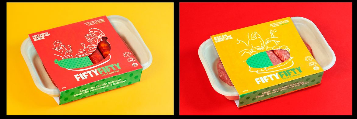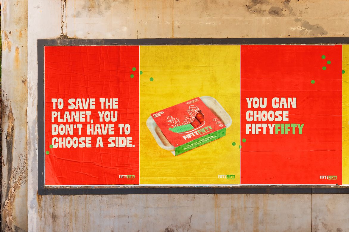 Fiftyfifty currently features two hero products; smoky chorizo-flavoured sausages and rosemary and garlic patties! The packaging of these items is presented, alongside promotional posters, and a product pitch box/book.