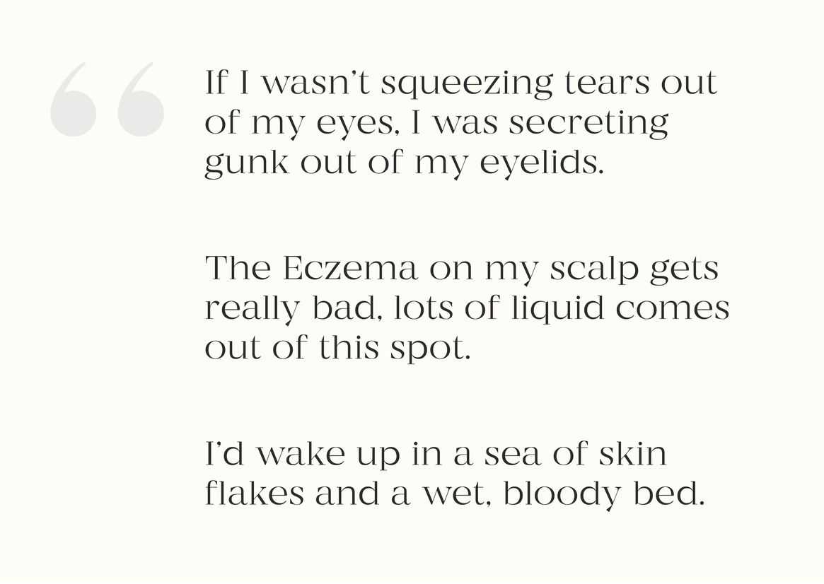 So, imagine your skin is cracked, bloody, and inflamed. You have spent all day and night resisting the itch, using cold compresses, and moisturising. These physical symptoms are bad. But what’s worse is when unaffected adults make flippant remarks, stare, or move away from you. These things can linger in your mind, making you overthink and over-analyse everything. Along with pain, itchiness, and lost sleep. Eczema becomes emotionally draining leading to depression in 7 out of 10 affected adults.