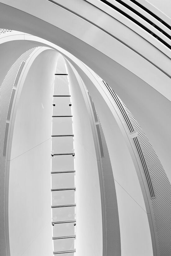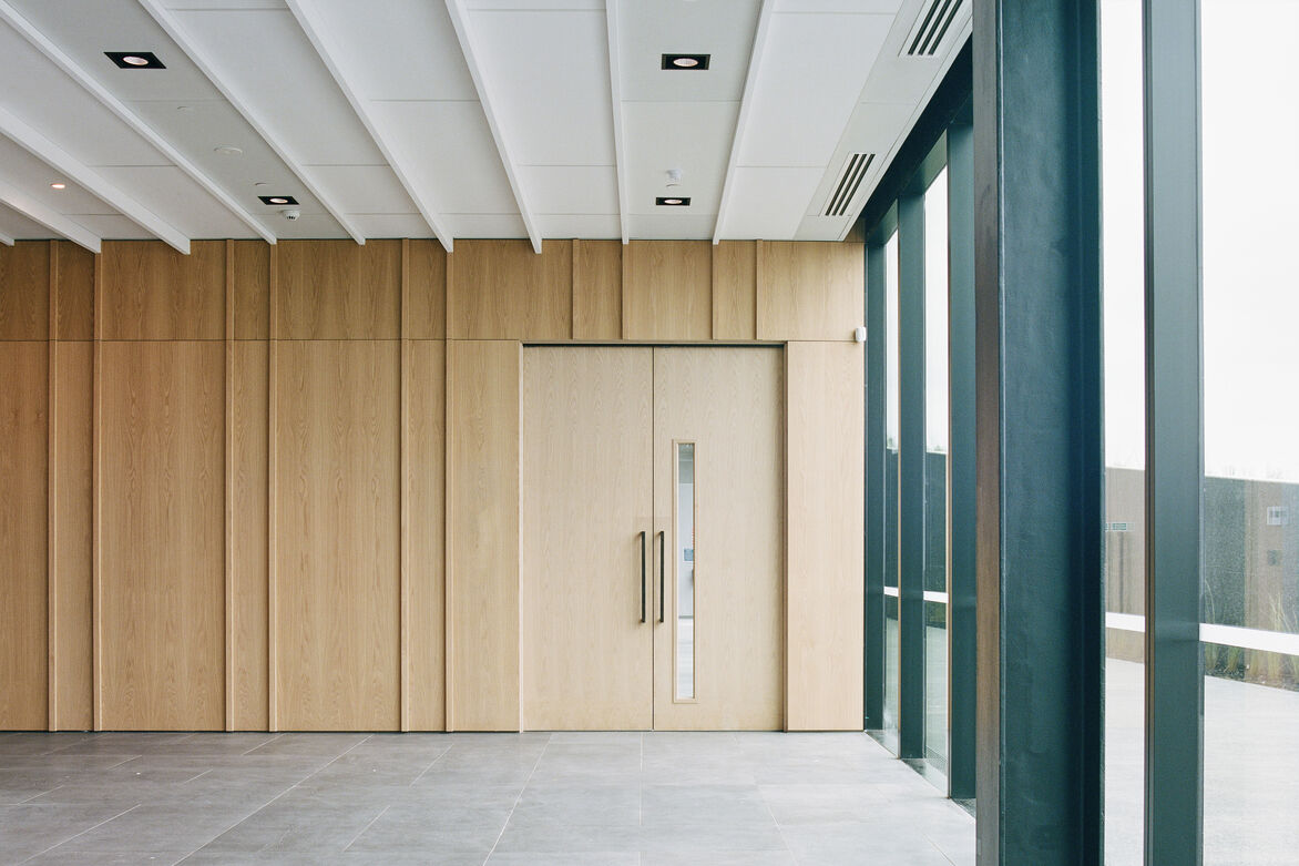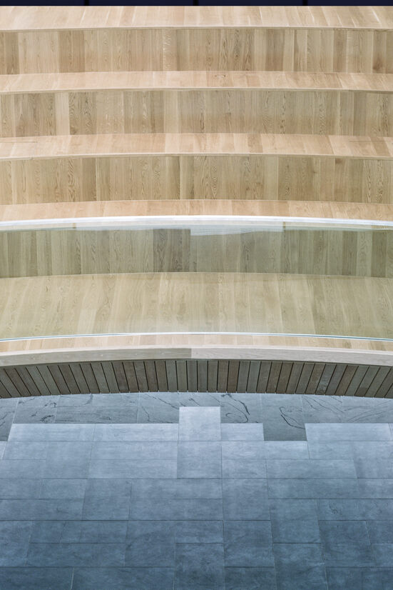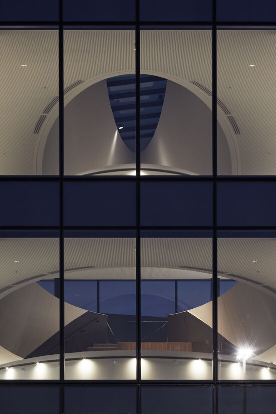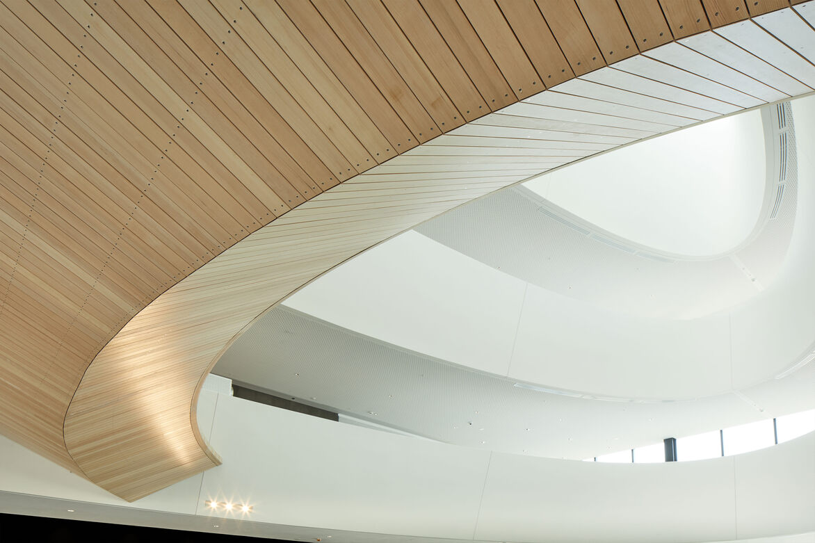 The elegant gesture of the roof rising from the landscape hides the complexity of delivering such a large building with an ordinary use. The complex geometries have been resolved with attention to details of materials and lines within the space.