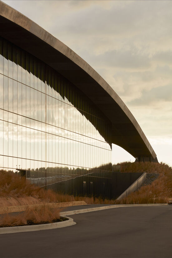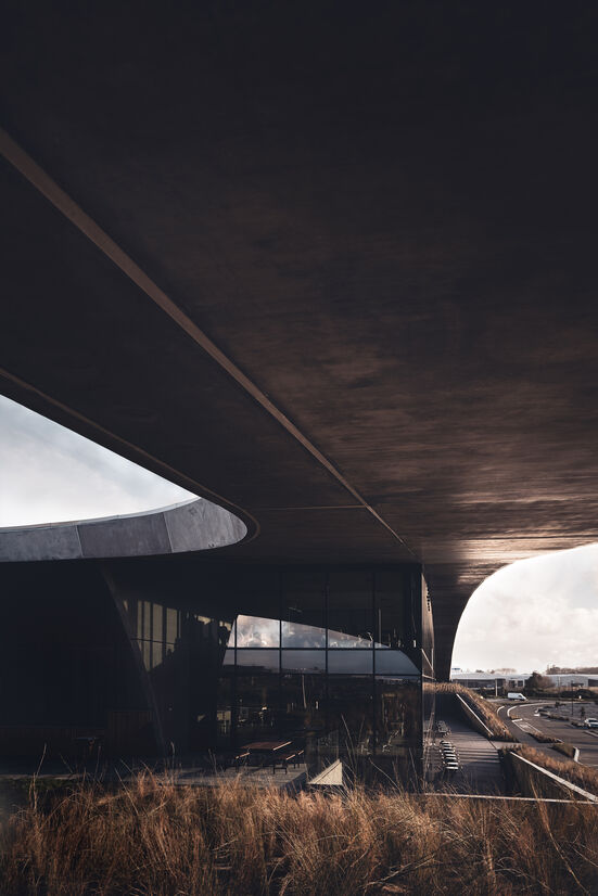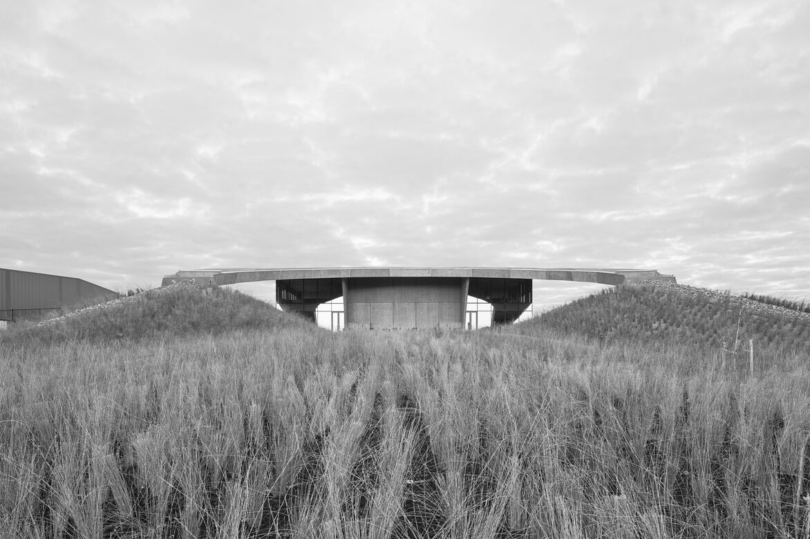 The building is conceived conceptually as an elegant structure that emerges from the surrounding landscape. Constructed earth bunds at both ends of the building rise to meet a concrete roof that arcs across the building’s 100m length.