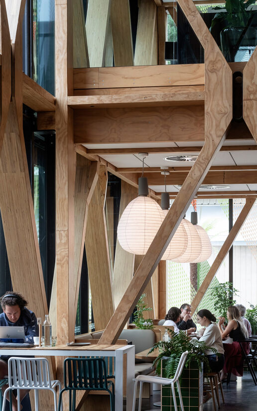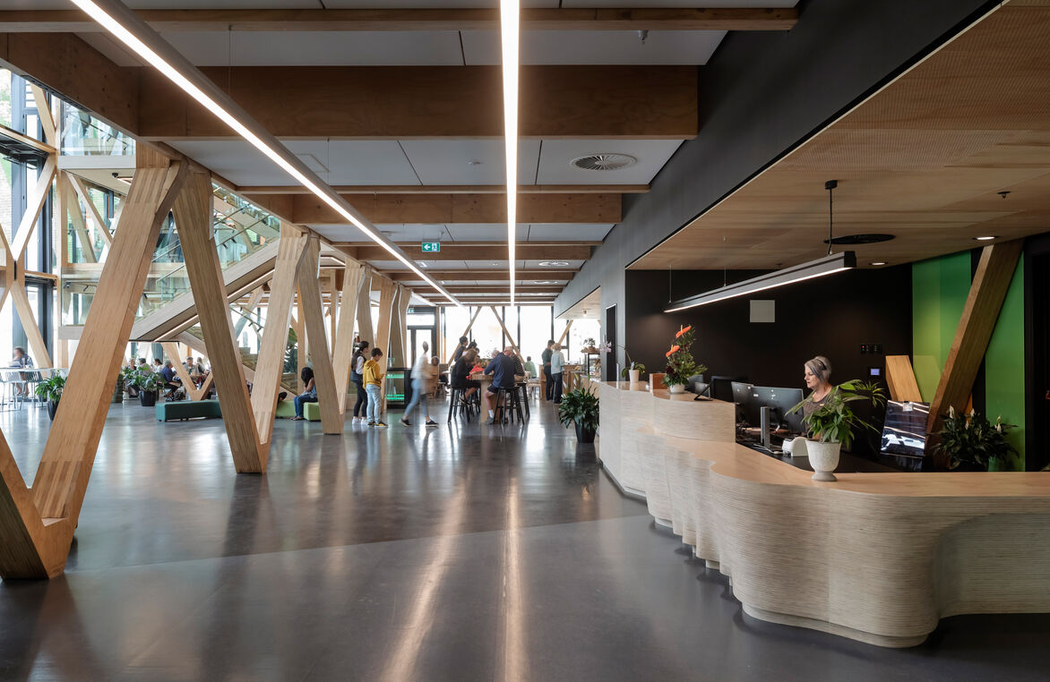 Named after Tuteata, an ancestor of the three local subtribes ‘Te Whare Nui o Tuteata’ is a cutting-edge showcase for engineered timber not only in terms of the aesthetic but what it contributes to a carbon-zero future. A trio of ‘peaks’ in gluelam timber, representative of the three hapu in the region, stand proud and tall at the entrance. Visitors pass beneath these portals to a triple-height atrium where a curated exhibition of wood-fibre technology and a café welcomes the public. Immediately present is the structural diagrid which rises three storeys to form the skeleton of the building. These structural elements are made of high-performing Laminated Veneer Lumber, and feature dovetail node joints which slot and glue together in an expression of craftsmanship. Looking upward from the atrium, the levels above provide the more private, acoustically considered open-plan office and collaboration spaces.