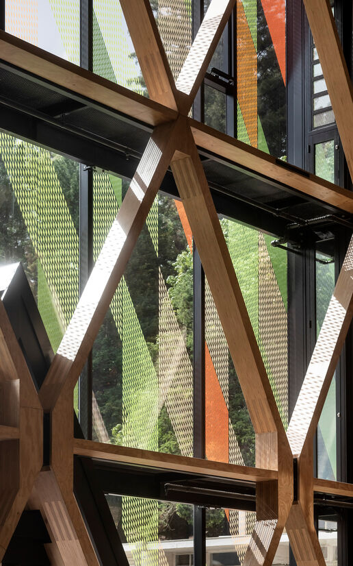 Extensive glazing to the building’s exterior offers an abundance of natural light and warmth and to provide views to Whakarewarewa forest outside. In order to draw in the public from the redwoods along Titokorangi Drive to the building’s warm and inviting interiors, the building needed to be visually striking. The design strategy for the boldy coloured fritted pattern to the facade evokes a leafy forest canopy over the timber structure within. Colours were inspired by the evergreen natives and deciduous exotics surrounding the building, both of which are utilised in the scientific studies carried out by Scion in their endeavours to promote forestry-based technology.