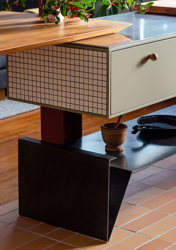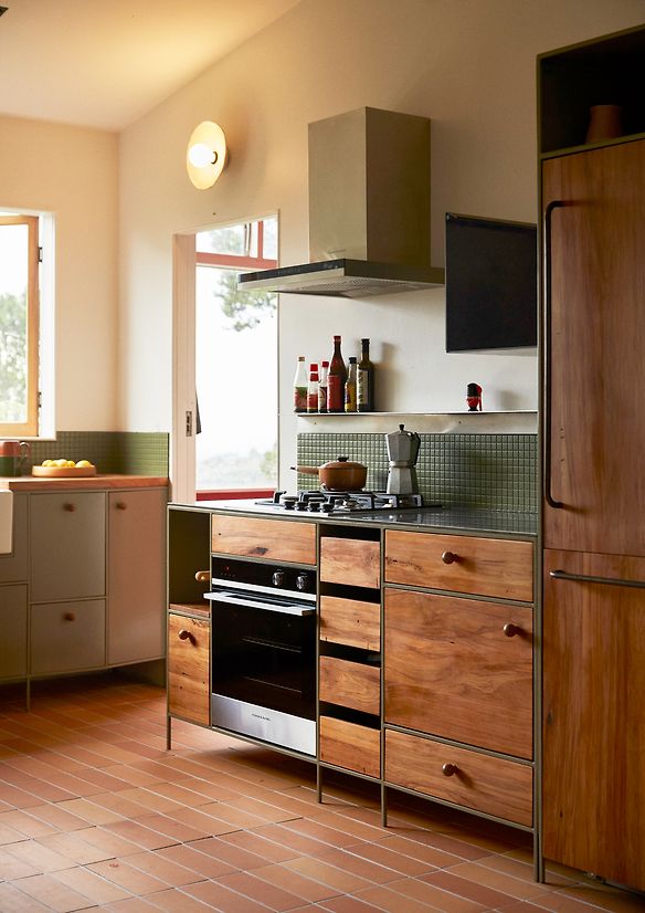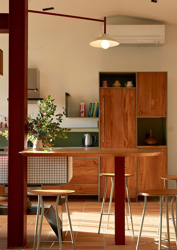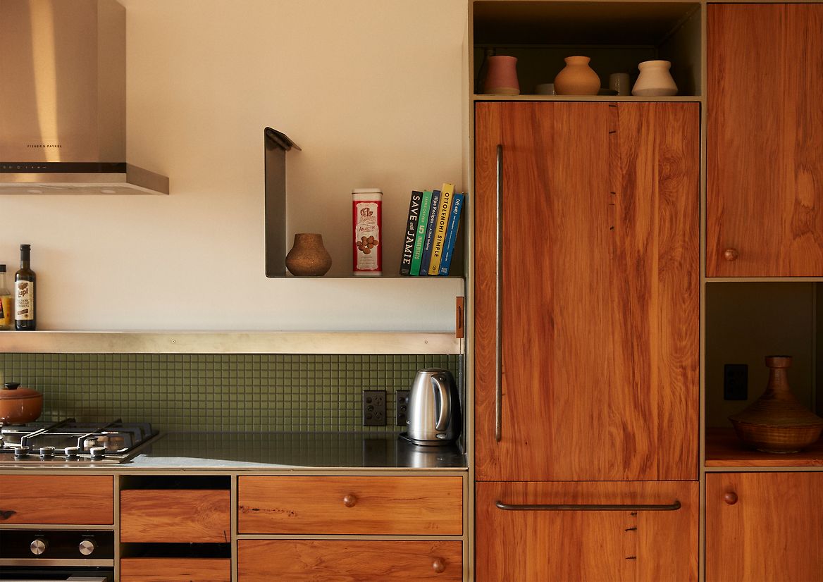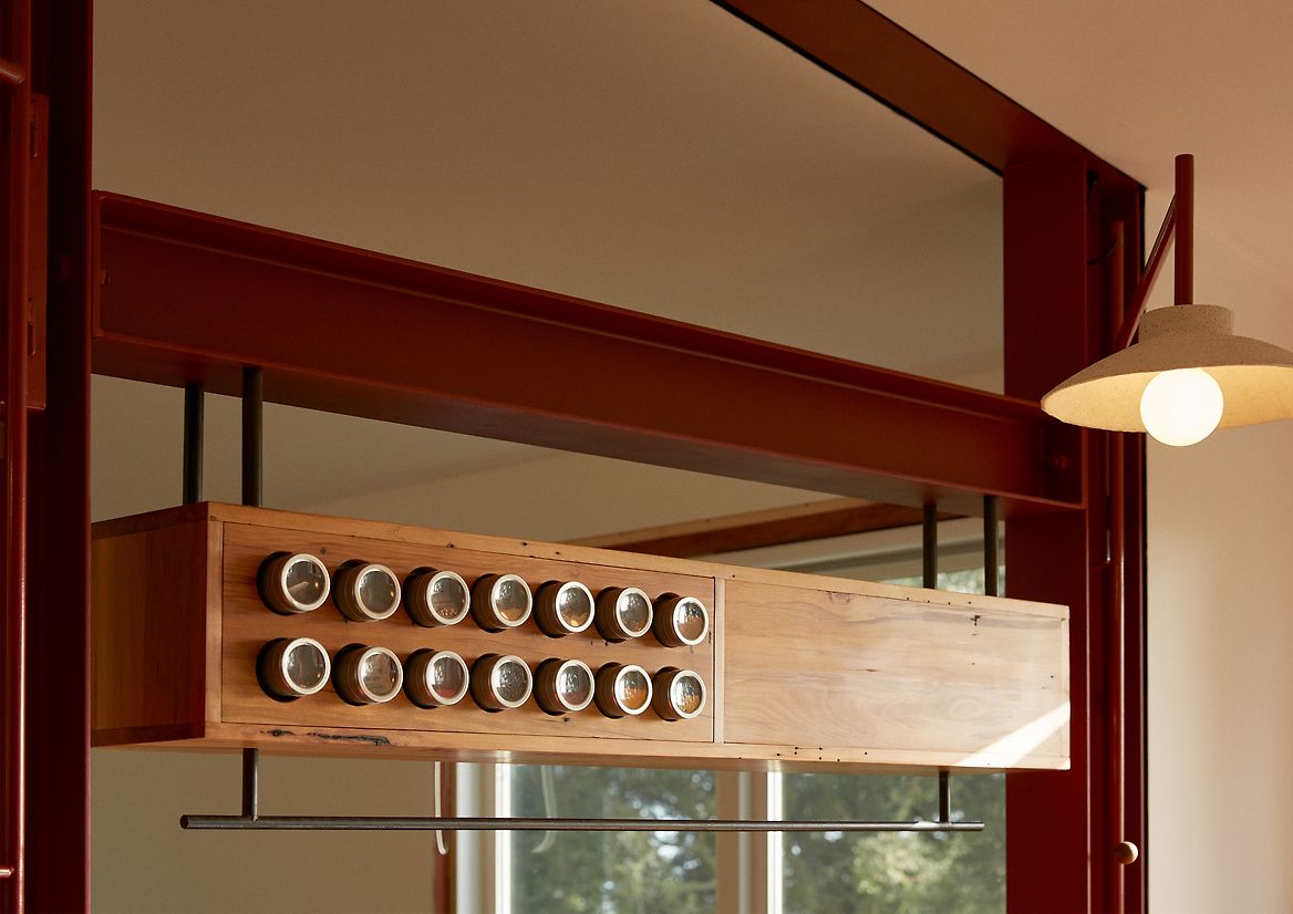 We designed a kitchen that reflects the beauty of the surrounding native bush and the craft culture of Titirangi while being sympathetic to the clients' humble 1950s wooden-framed house. By removing the dividing wall between the kitchen and lounge and replacing it with structural steel, the design opened up the kitchen towards the lounge and created more vistas towards the bush. Embracing the structure of the steel beams, we were able to suspend the peninsula, pivot lights, and spice station. The result is a vibrant and productive bazaar-like atmosphere acting as the social hub of the house with scents, colours and rich, crafted textures stimulating the senses.
