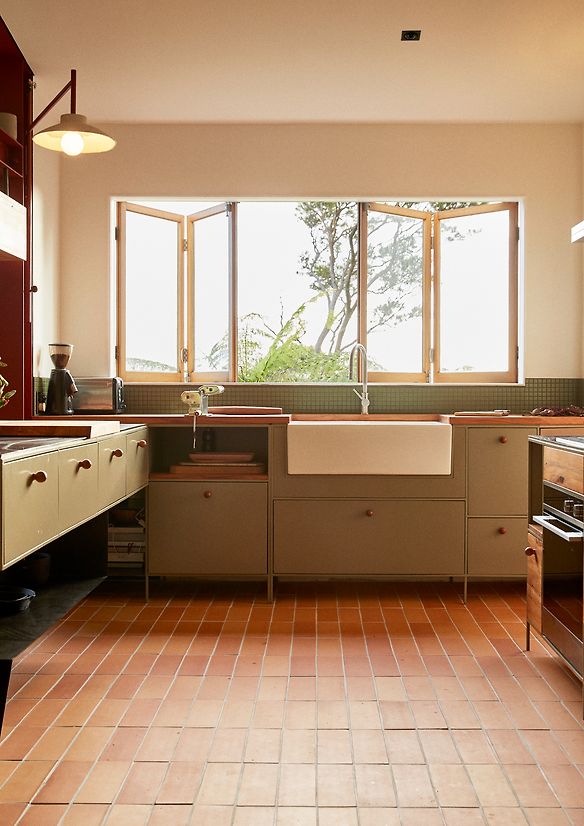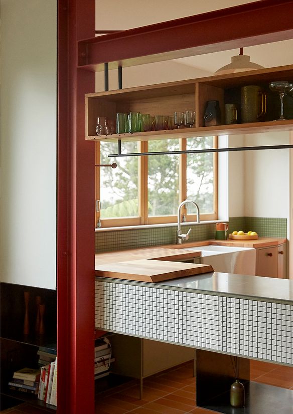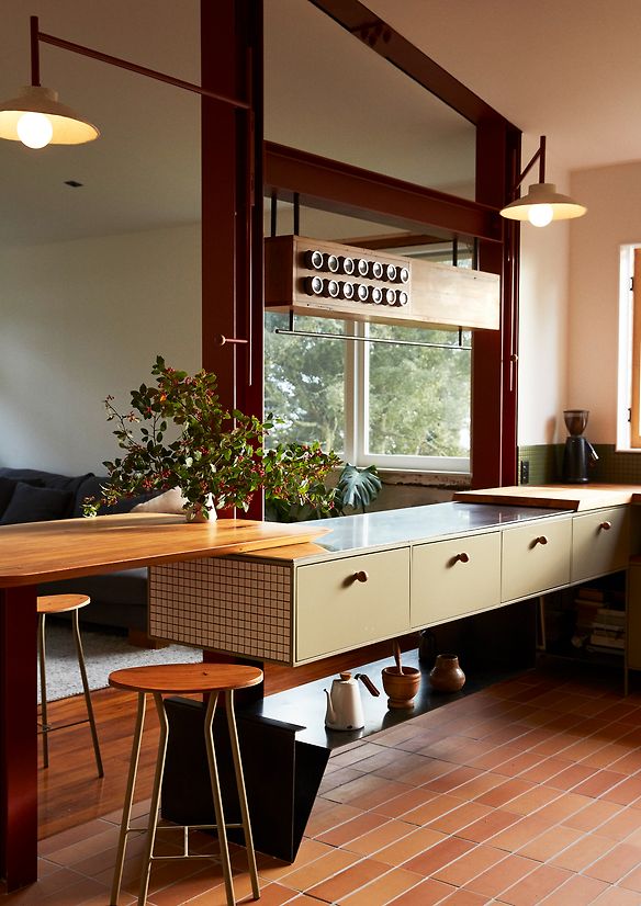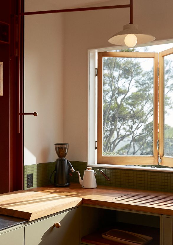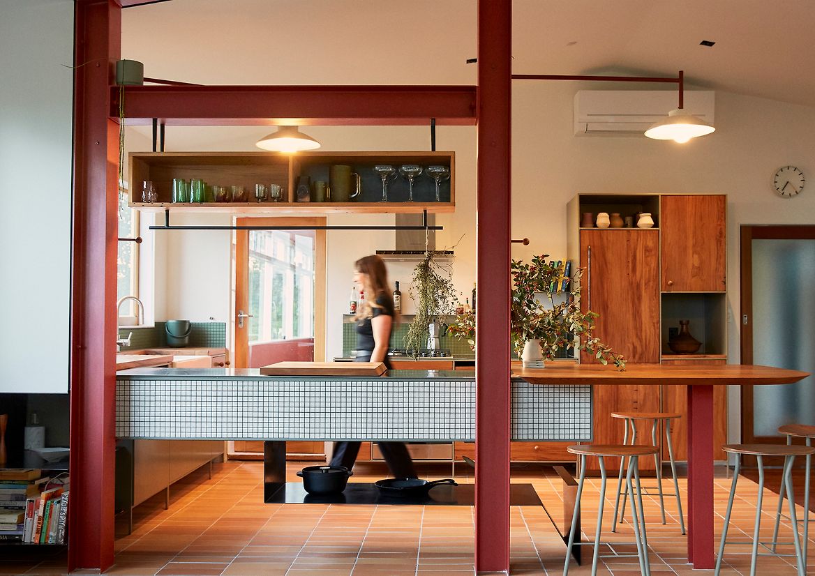 The kitchen design balances modernity and humility with a bold use of materials and textures. Oiled recycled rimu and hand-turned knobs contrast with the visual lightness of the steel framework. Folded steelwork was blackened through a chemical reaction to intensify its surface quality and increase water resistance. The colour palette is inspired by the bush with a soft lichen hue powder-coated on the steel cabinets and deep red accents on structural elements. Terracotta tiles were added to the kitchen flooring area, complementing the warmth of the recycled rimu. Additionally, three custom handcrafted lamp shades were created with black sand mixed into the clay as a nod to the West Coast beaches.