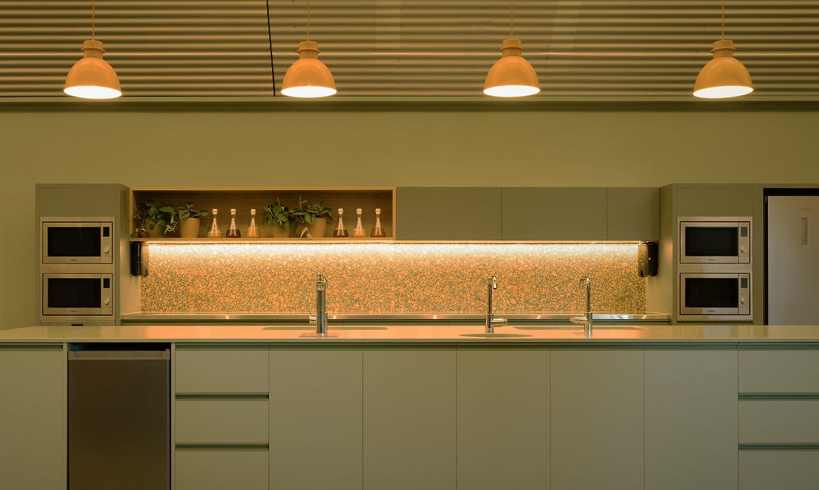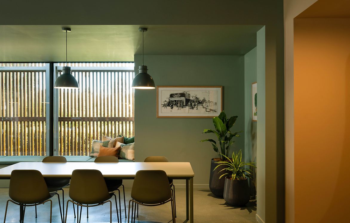 The natural toned scheme continues in the large lunchroom space with the stained concrete floor throughout, two tone green kitchen cabinetry and matching benchtop and seating zones.