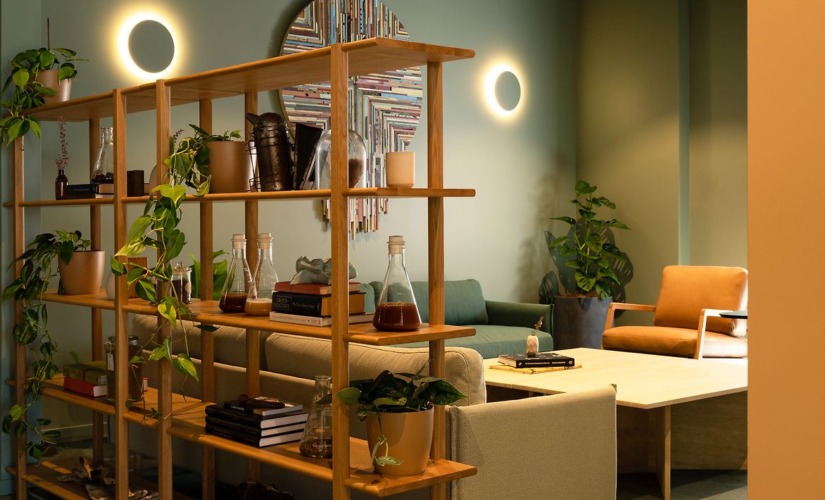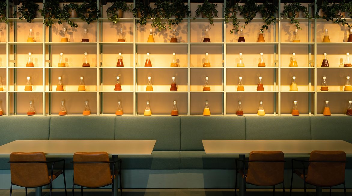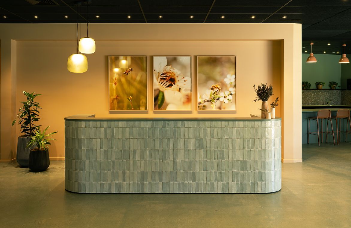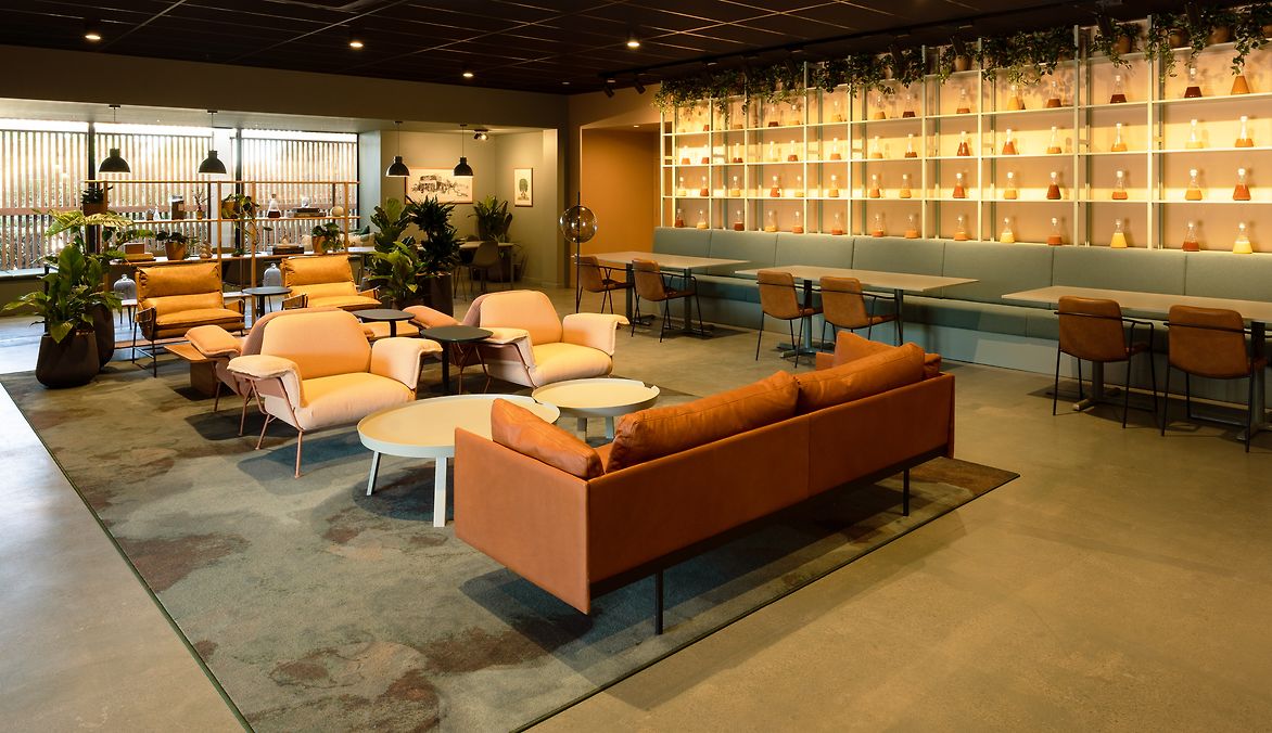 On arrival you are greeted with a warm wall of lit honey in lab vessels which creates an impactful focal point. In front is a 10 metre green upholstered bench seat with tables for perching with your laptop.