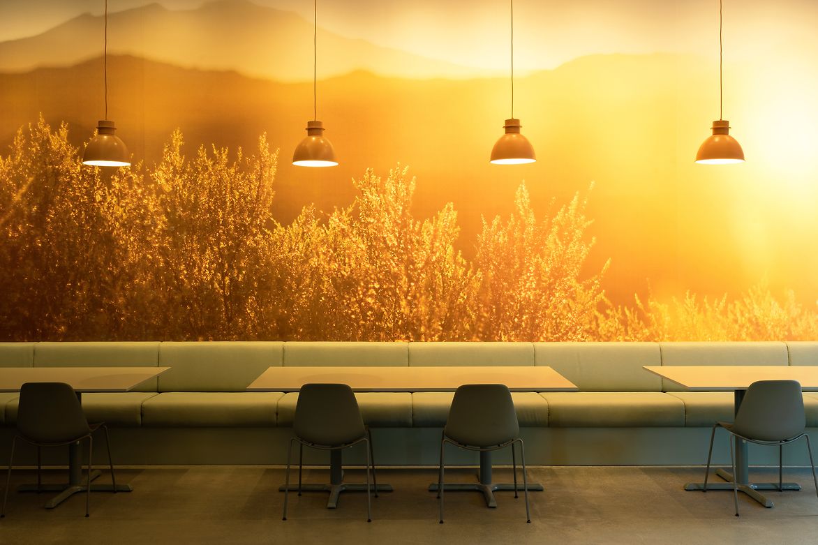 We used an unexpected palette of cool greens and warm golden tones to create dramatic spaces that felt like home to the nature loving staff.
