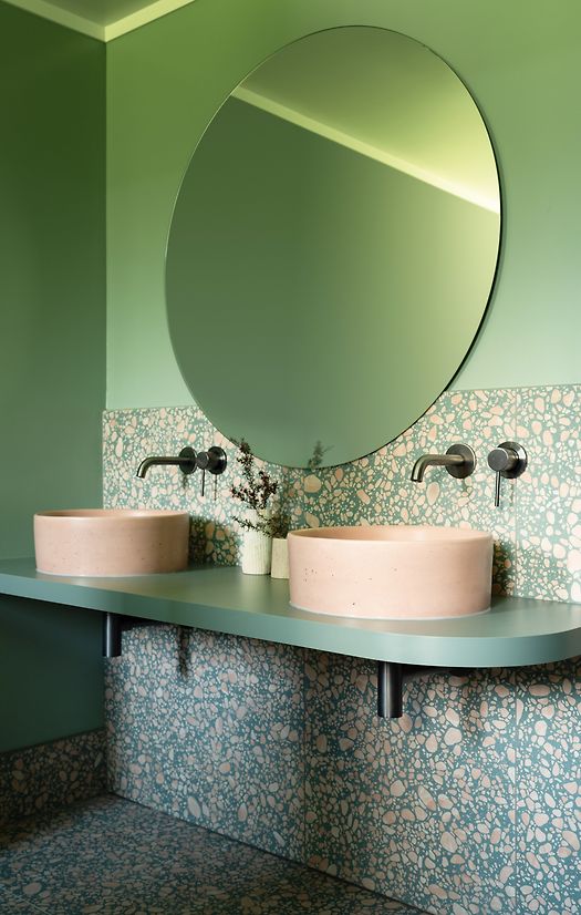 The playful terrazzo look tile in greens and honey drops is featured throughout in splashbacks and bathrooms.