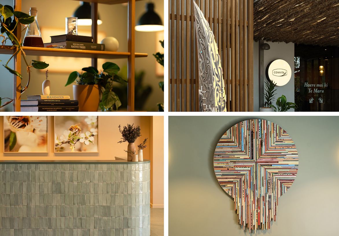 New photography from Comvita’s regenerated forest was commissioned to bring a contemporary edge to the space used in frames and as a large wall mural.