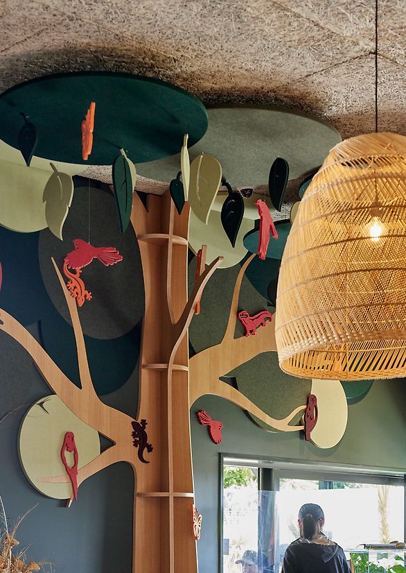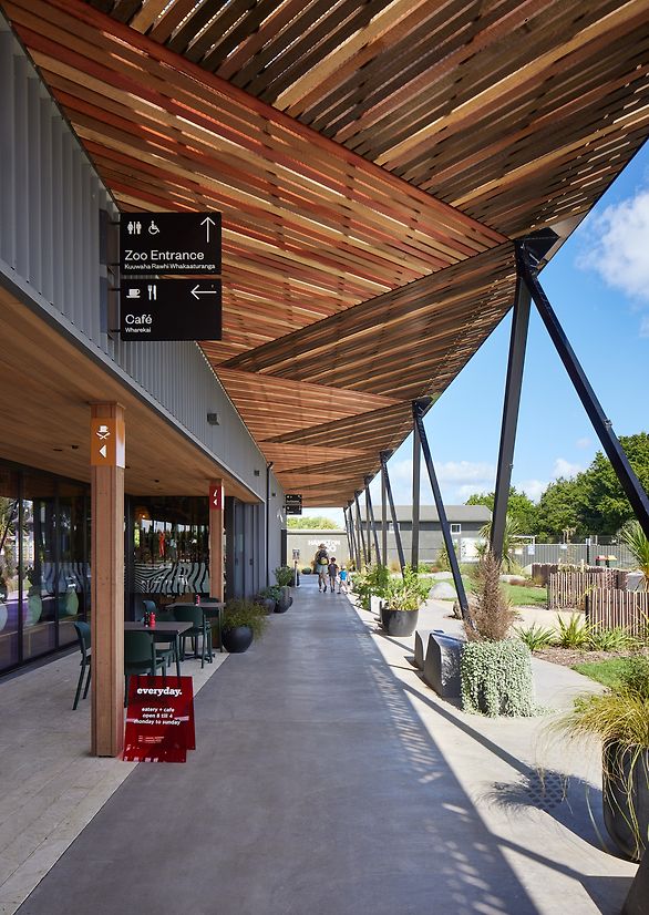 The Kaakaa narrative is referenced in a singular roof canopy that spans across the road, like outstretched wings acting as the gateway to the precinct. The architecture flows as an extension of the kaakaa wing canopy to become a multi-purpose arrival building incorporating hospitality, retail, visitor kiosk and precinct offices and amenities. The red and brown tones in the timber of the canopy mimic the Kaakaa's prized under-feathers, and act as the thread from outside to inside. Landscaping elegantly integrates vehicle parking, while educational nature paths and a viewing tower offer deeper opportunities for visitors to engage and interpret their context. The interiors feature natural materiality wherever possible with a central wall rendered in a rammed earth effect, flooring in homogenous recycled rubber, and locally sourced and recycled woodtex panels in the ceiling. Hospitality zones incorporate local Hinuera stone and a strong focus on biophilic design throughout. The retail and information spaces showcase a range of enticing wares in bespoke cabinetry with playful zoo animals hovering overhead.