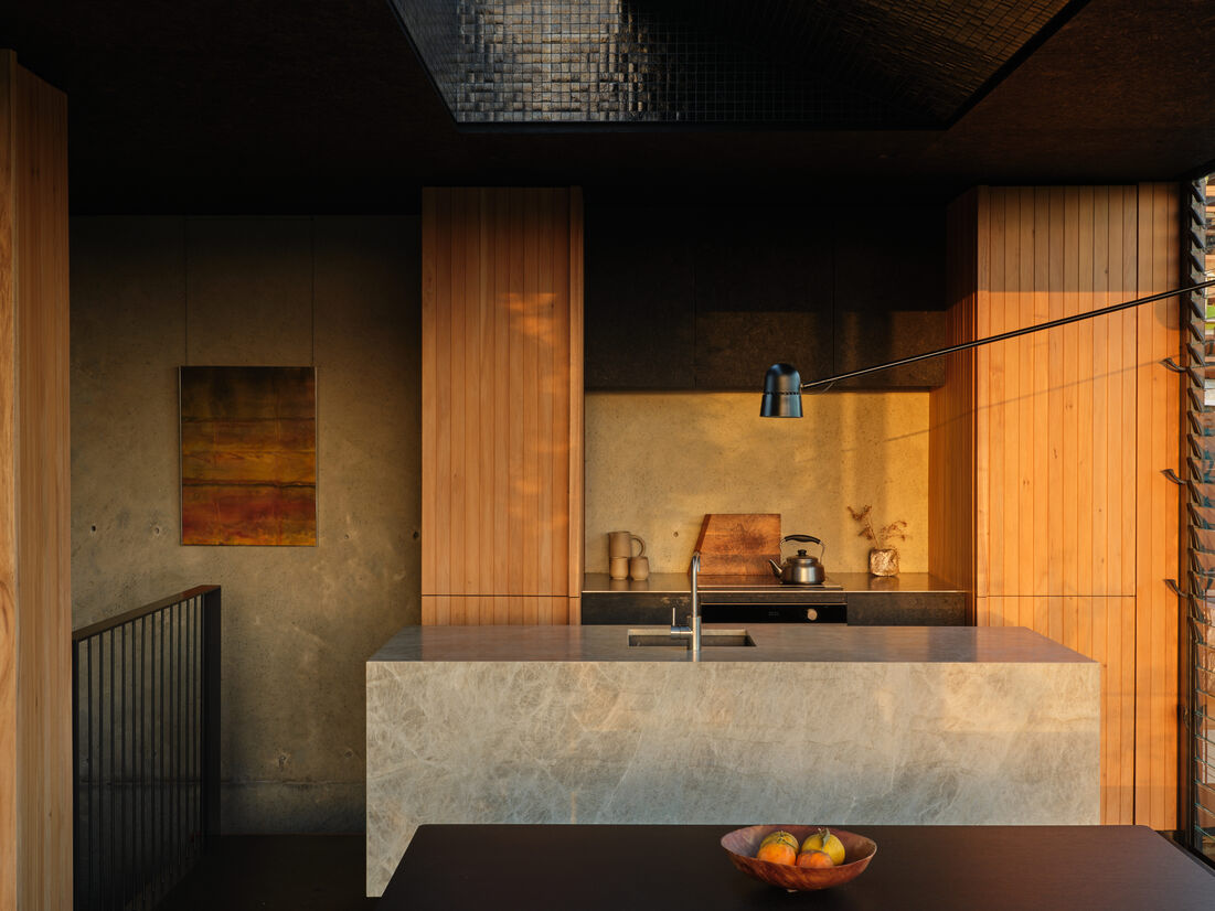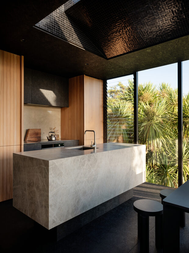 Light, shadow and materials have a symbiotic relationship here. The robust external form opens up from within, with glazing providing a connection to the wider streetscape and surrounding natural elements. Light and shadow inform an ever-changing palette. Exposed concrete forms a thermal moderator, black floors and ceilings compress and absorb light, Totara timber wall linings provide warmth and a consistency for the vertical elements in the room, the stone bench is raised on a plinth – designed as a piece of furniture.