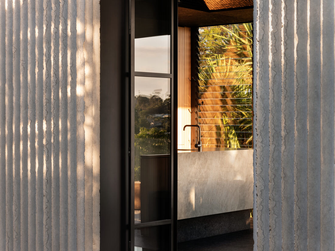 Anchoring the home to its site sees the use of fluted concrete formwork to create a sense of permanence. The structure sits pushed up toward the boundary, creating a courtyard garden.