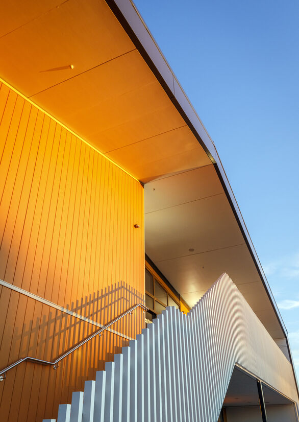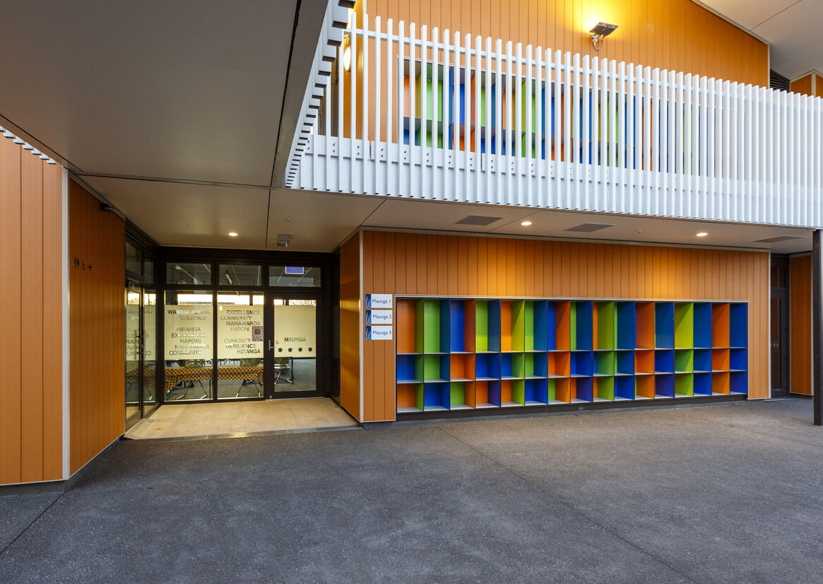 With a strong form created by a single gable pitch roof, the whole building is described in one gesture. Two-store tall, precast concrete blocks have the texture and imperfections of natural timber, giving an organic, earthy look, whilst being robust enough to withstand the wear and tear of school children using the space for years to come. These are overlaid by sharp shadows from the horizontal louvres, which use dark colours and natural materials that will age with time, creating an organic look that contrasts to the brightly coloured interior and external cubbyholes. These tie in and directly correlate with the schools colours and values.