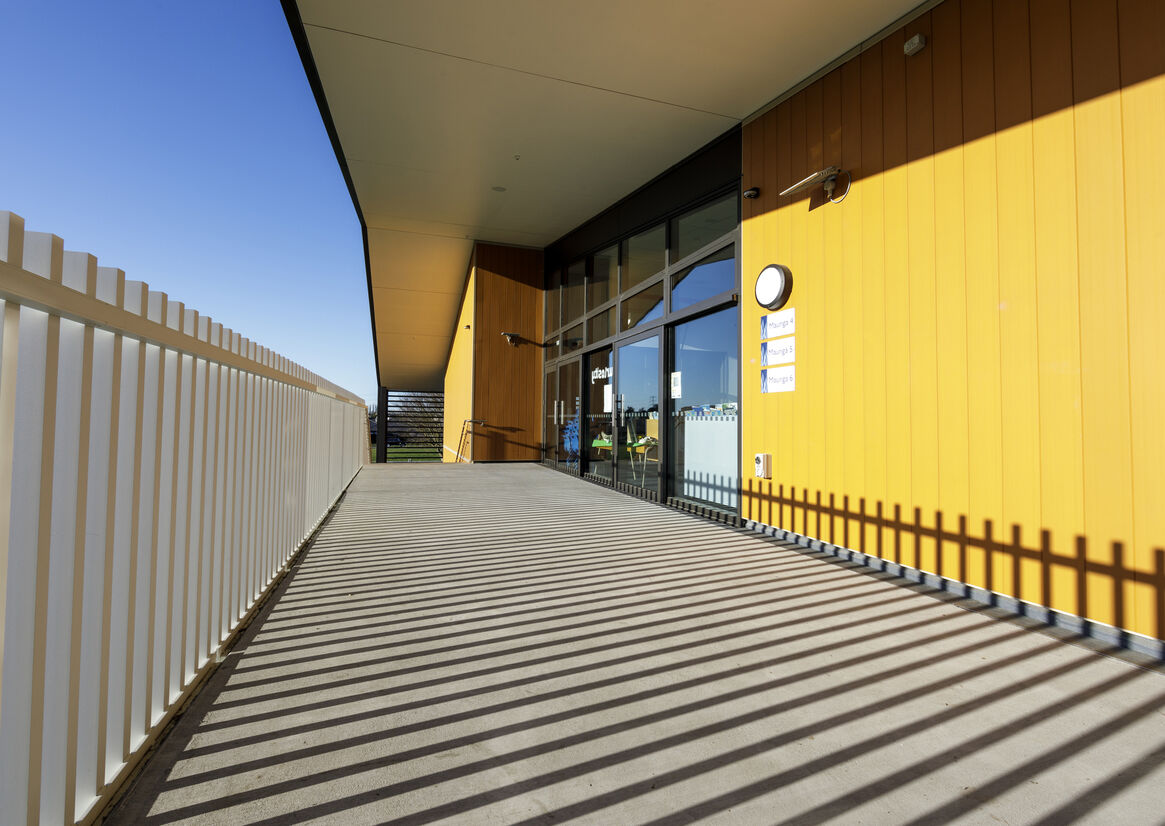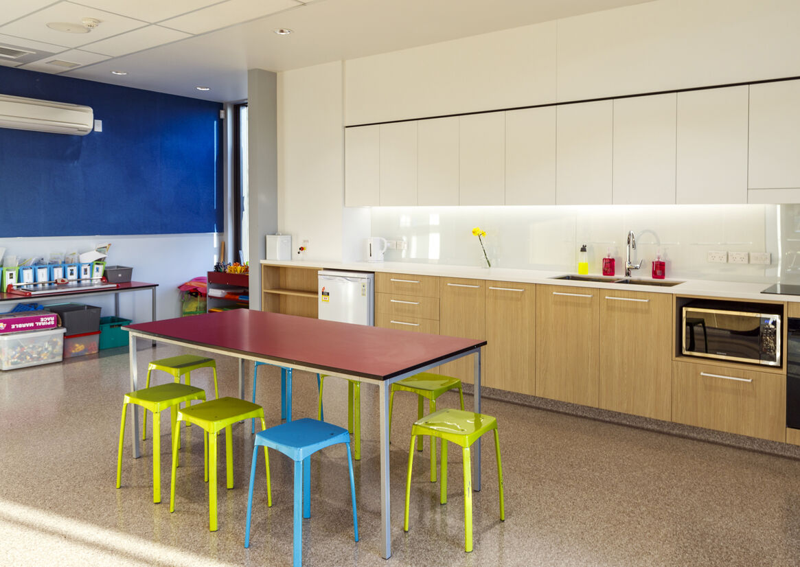 The design incorporated best-practise natural lighting and heating design principles. This included undertaking a sun and shadow projection analysis which determined the space’s best orientation and avoided shadowing neighbouring properties. Large, solar-protected windows and a carefully chosen orientation allow natural daylight into the building. Generous, overhanging exterior louvres on the north-facing side provide shade. These features block the high sun while allowing low winter sun through, providing a high level of protection from prevailing winds. Ultimately minimising the need for additional lighting and heating, reducing electricity costs. Interior materials were chosen to be soft and welcoming, while resistant to the wear associated with high use.