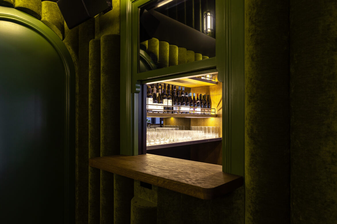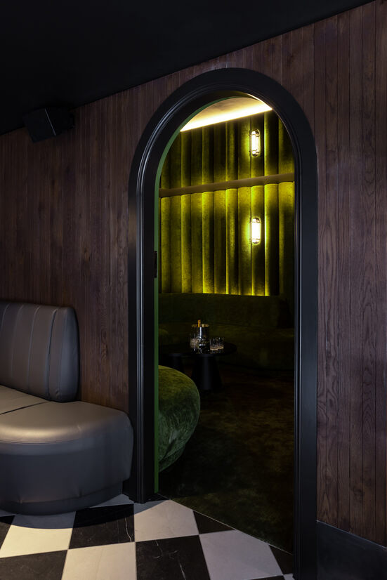 The exterior façade of The Shy Guy remains relatively untouched from its existing state, demonstrating a minimal intervention to the building fabric. Signage is small and discrete and the windows are covered with a dark tint - allowing for an element of surprise and discovery within. Inside, rich velvet banquettes sit within crafted arched nooks and a striking lighting installation reflects off every surface.