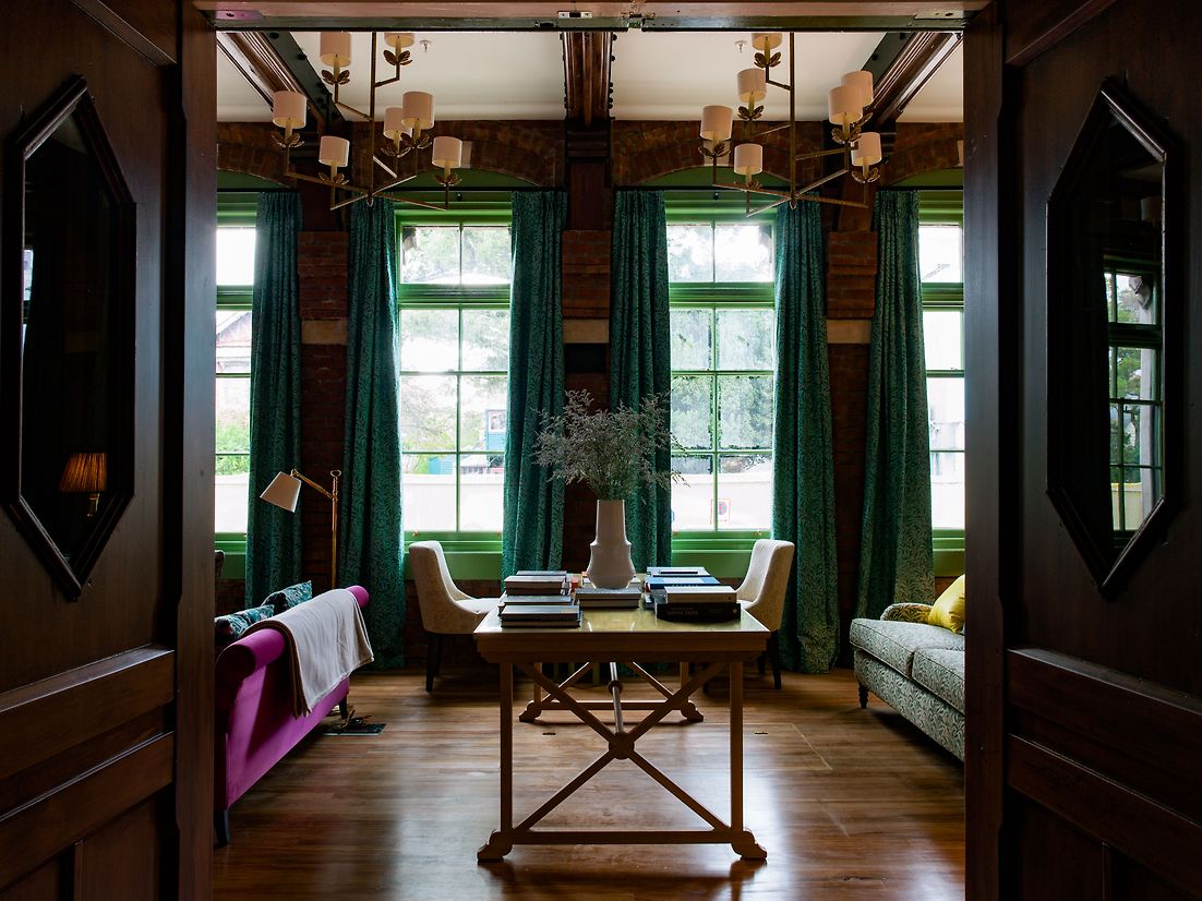 In seeking to minimise the visibility of a traditional transaction and enhance the personal experience, I created a version of a hotel that felt more like a large private house. Guests arrive in the Reception Room which acts as a large drawing room. Against a backdrop of original pointed red brick and reclaimed rimu flooring a central arts and crafts style library table is piled high with New Zealand art, architecture, history, and garden books. Various seating arrangements made up of custom designed furniture in orange horsehair, yellow chintz, recoloured Morris, dark pink velvets and indigo prints sit alongside locally sourced antiques, lacquered black side tables, brass and ceramic lamps and calm sisal rugs.