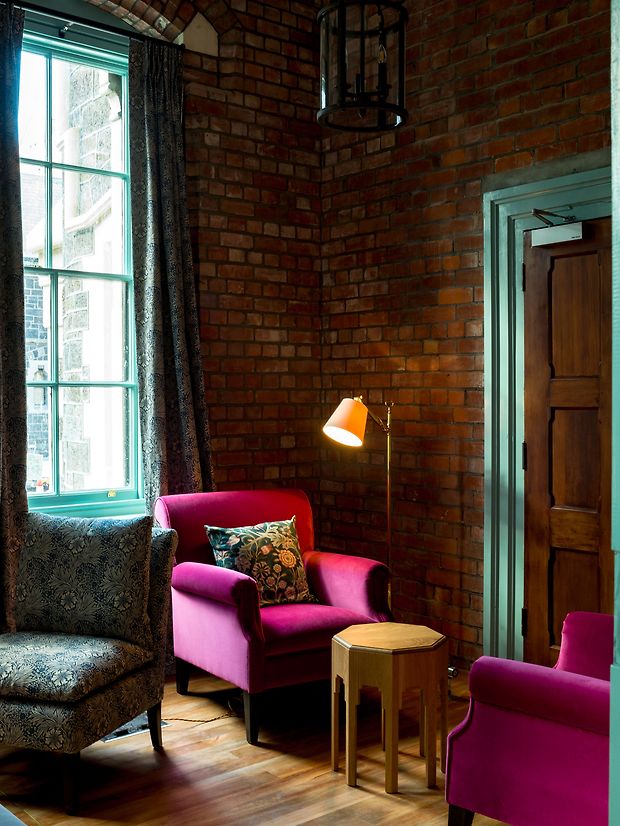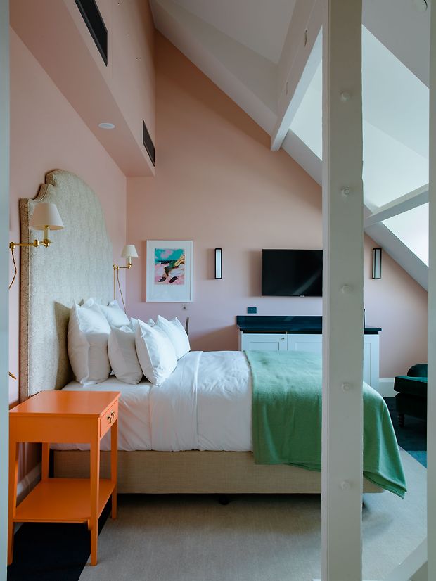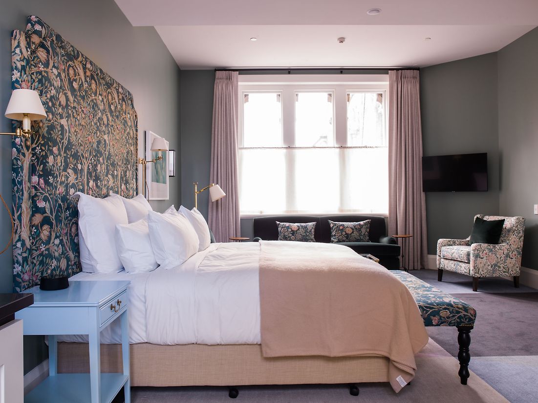 As no two rooms are architecturally alike, paint was employed to highlight classical architectural details and to create a connective tissue between rooms and all three buildings. Each guest room has a distinct personality and its own entirely original scheme. They are richly layered, utilising the very best materials; velvet, lacquer, stone, linens and brass. William Morris was one of the most prolific Arts and Crafts designers and his iconic prints were an important historical touchpoint throughout the design process. I chose to include Morris fabrics in every room, pairing the original designs with wild colour combinations, catapulting them into the 21st Century.