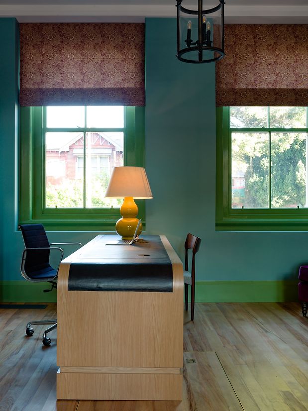 Unique, oversized headboards were created to accentuate the high ceilings in the relatively compact bedrooms. The bedside table and desks, Georgian in concept, were made locally and lacquered in an array of vivid colours. Inspired by a retrospective of Gordon Walters I designed a colour blocked wool carpet in shades of blue, purple, pink, green, brown and fawn.