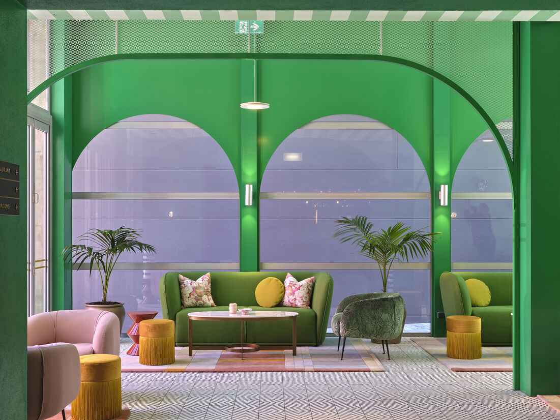 The 'Parlour' at Naumi Studio Hotel Wellington references the Edwardian heritage of the Building. Taking cues from light-filled reception rooms of the period, and Parisian conservatories, we pushed the boundaries with colour and pattern, creating a relaxing space drawing people in like moths to light!