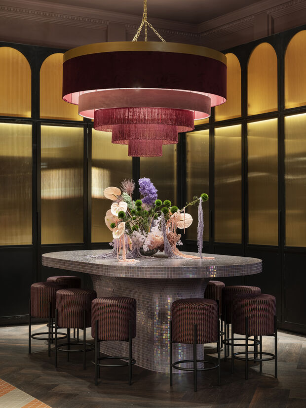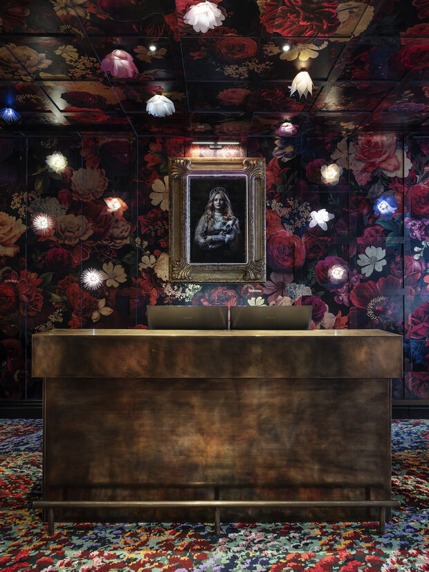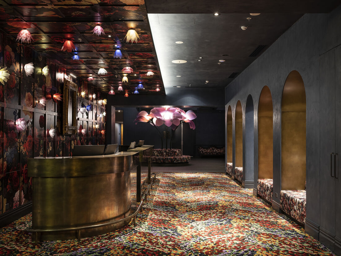 Upon entry to Naumi Studio Hotel Wellington maximalism takes over! Our vision for a wondrous Edwardian garden full of lush florals was crafted by some amazing artists! The large-scale gold leaf floral backdrop, created by The Art Dept wraps up onto the ceiling and is majestically scattered with lit floral sculptures by Angus Muir Designs. In front are curved bronzed brass reception counters, standing solidly on a field of flowers in the form of a bespoke rug, created by Designer Rugs with artist Karl Maughan.
