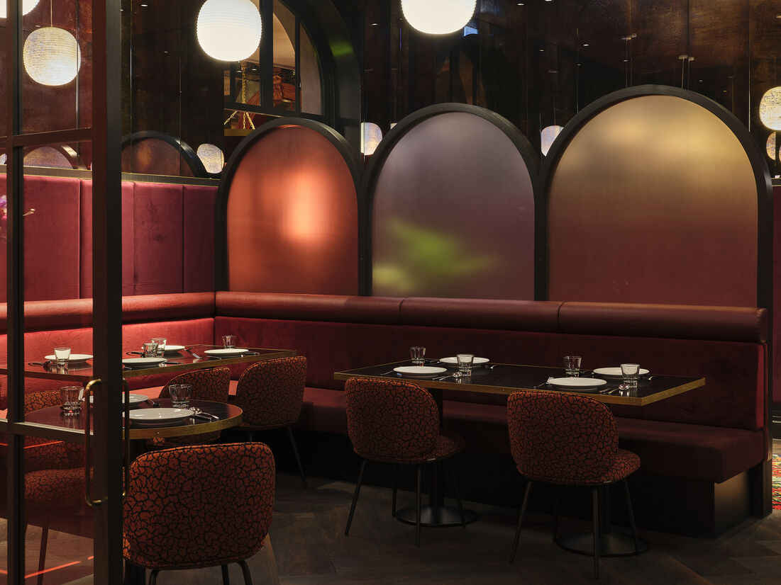 The corridors were inspired by the fictional character 'Lady Naumi' and her Husband's journeys on the Silk Road. Each level is a tonal gradient of one colour. Mimicking the changes in hue at sunset and sunrise, each corner you turn is a different experience. The use of tartan was inspired by the process and aesthetic of pulling and weaving silk, our nod to the fictional character 'Lady Naumi' and her Husband's journeys on the Silk Road.