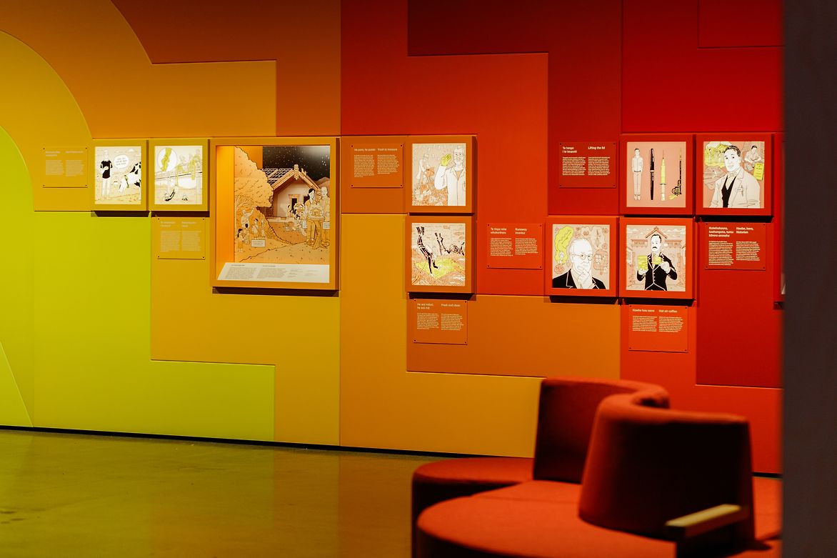 In Te Puku, the colour palette reflects concepts of the belly, gut and heart and we took cues from the architecture and content structure using high-contrast colour to define each of the key zones. Colour management extends across joinery, print, multiple AV, digital and interactive experiences.