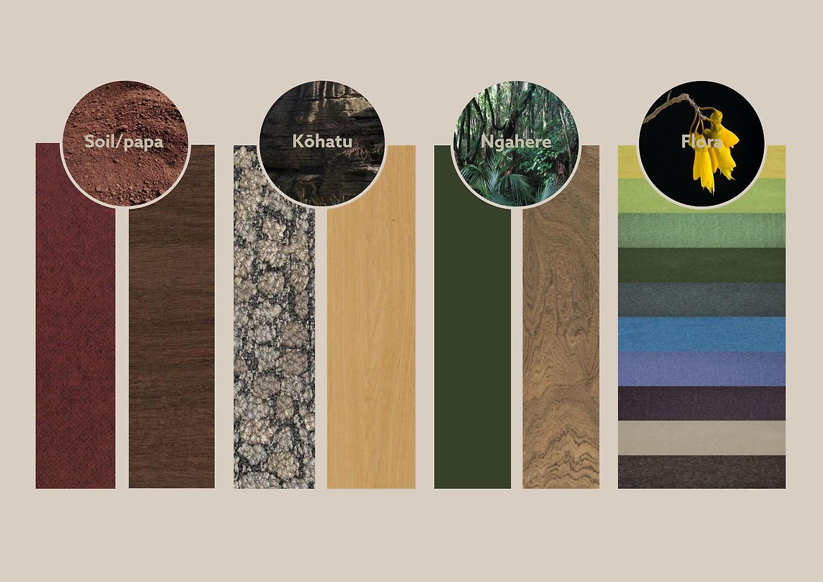 Colour palettes of the whānau centre were carefully chosen to reflect the natural environments of the Ngāti Hine rohe, with an overarching theme of earthy brown tones blending with green tones of the ngahere canopy. In conjunction with this, the designer and artists sought to encapsulate the visual tones of colour that reflect the flora found within this area of Te Tai Tokerau. The colour palette aimed to create a sense of connection to the whenua and natural environment, providing a warm and welcoming space for whānau to gather and seek wellness.