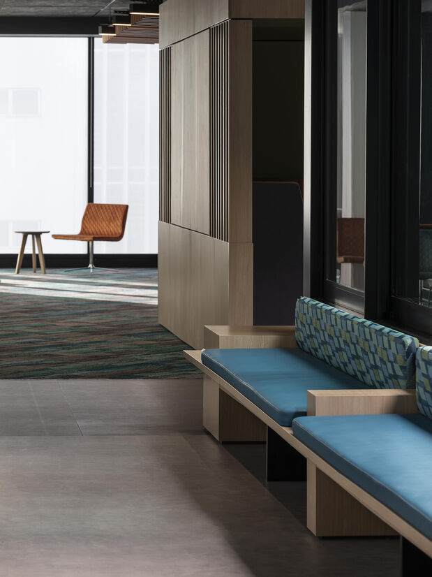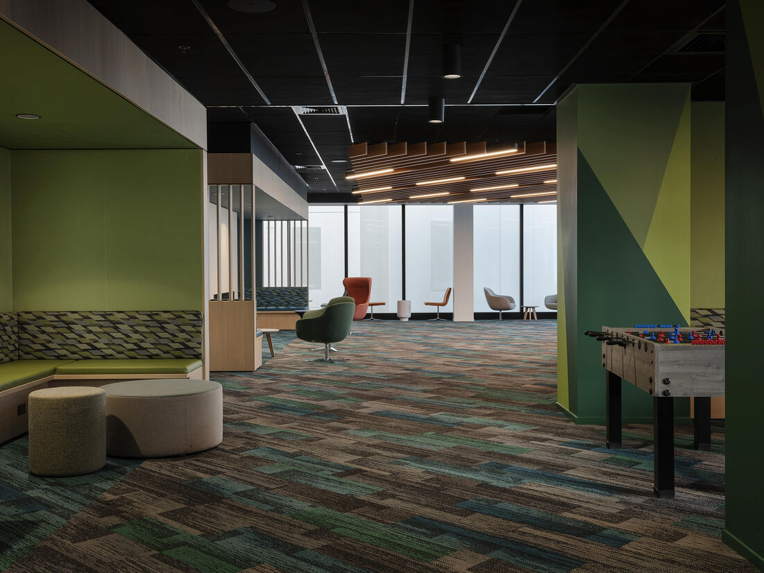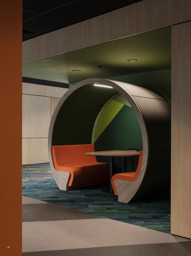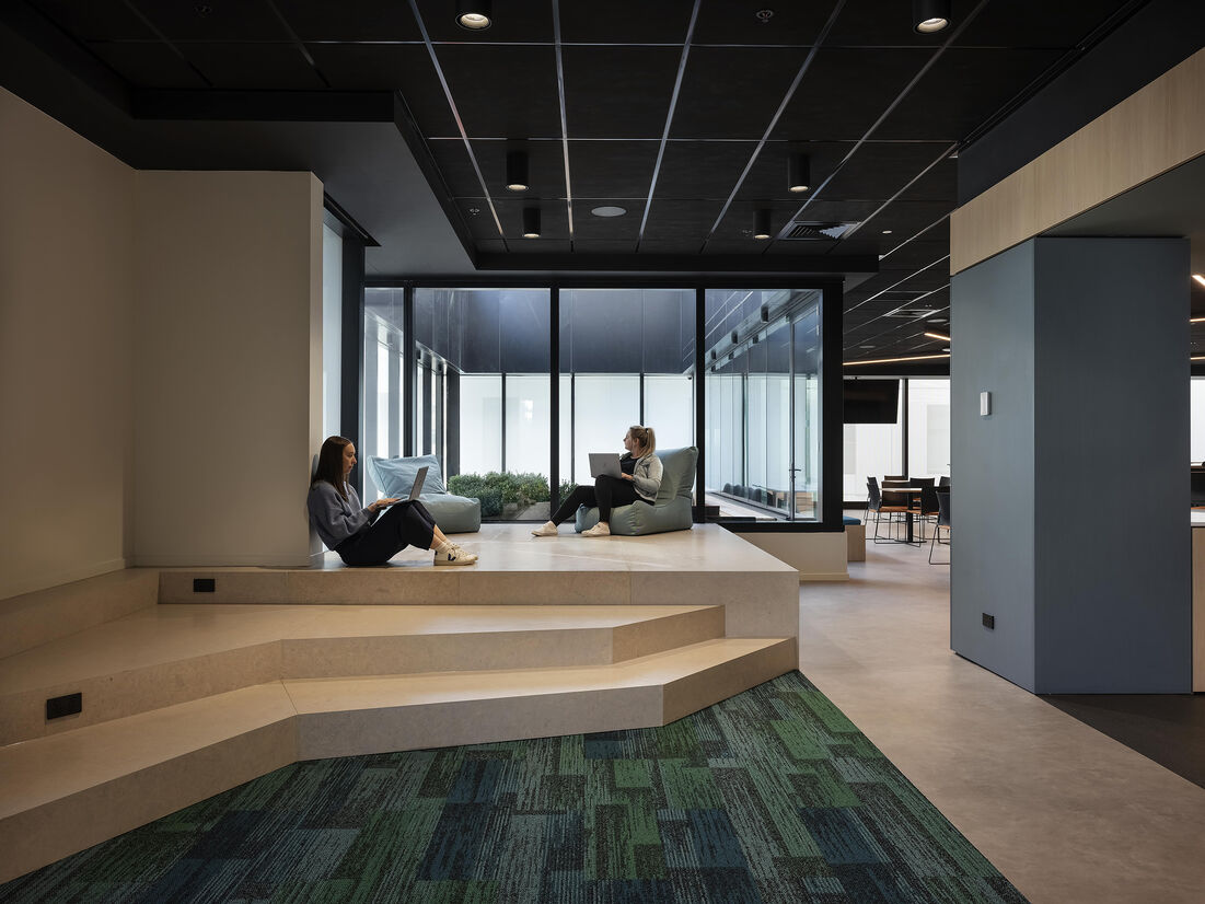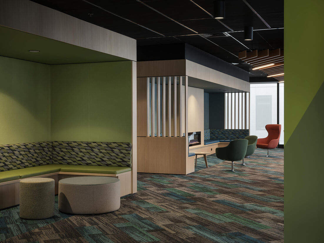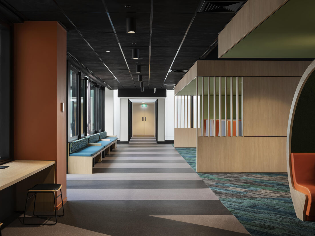 The main student lounge features a timber fireplace pod that anchors the space and creates a sense of congregation and comfort. Colour was an integral part of the overarching design, with a fractured lineal aesthetic. The directional floor finishes enhance wayfinding and zones are further defined through changes in colour, texture and finish.