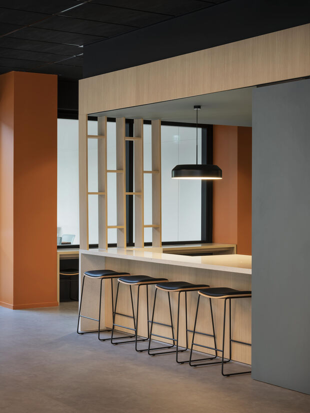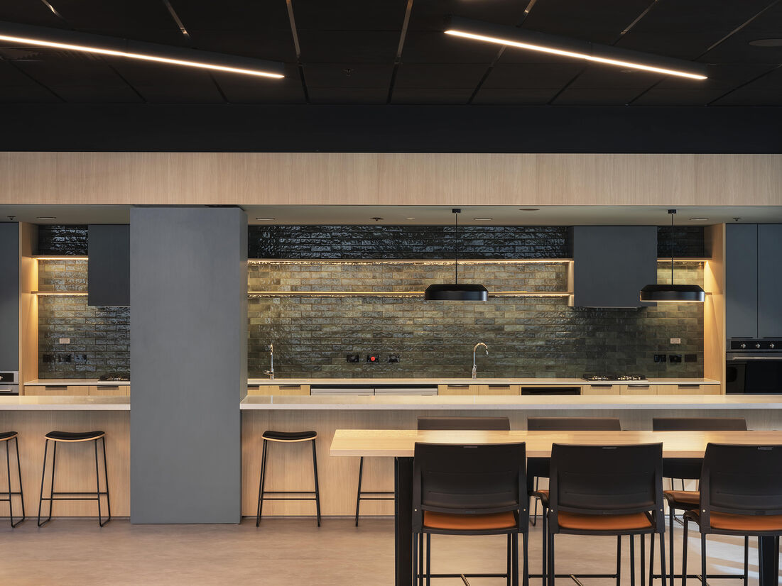 The lift overrun was a design challenge that was resolved through a tiered break-out zone finished in stained strandboard. Materials were selected for their cost efficiencies without compromising on performance or aesthetic. This project showcases how a tight budget need not encroach on a strong design outcome.
