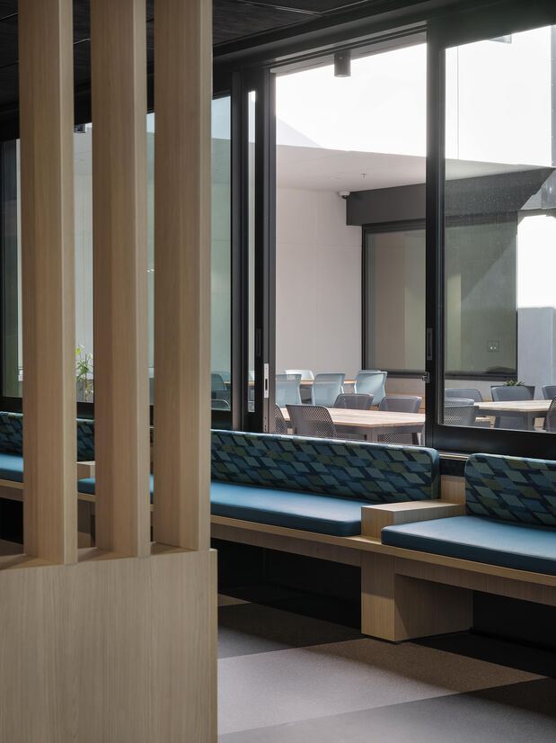 The multiple study pods are defined through geometric feature elements of paint, acoustic panelling and upholstery to add interest and vibrance to an otherwise pared back neutral base palette. The space also includes a music room with acoustic wall treatments and a private study zone with defined study pods. Colourful banquette seating lines the perimeter of the central courtyard that feature an outdoor BBQ area.