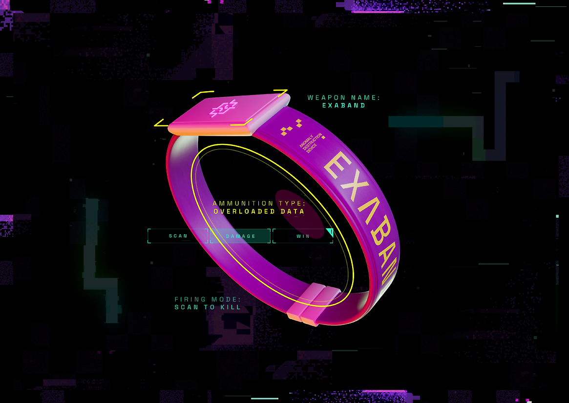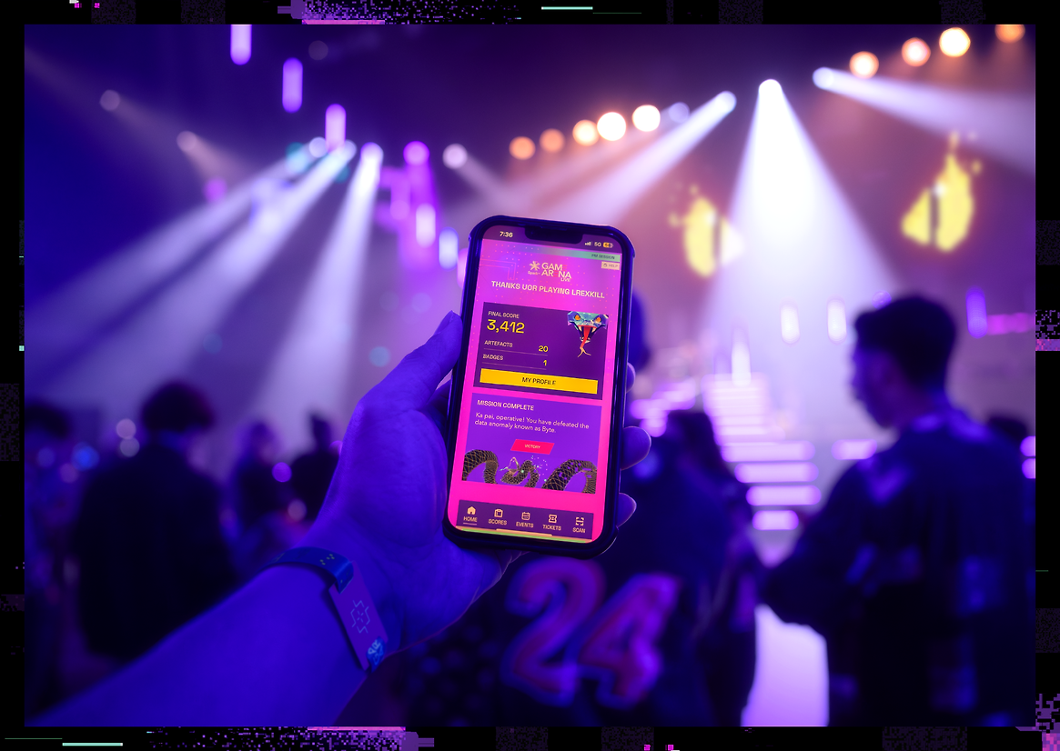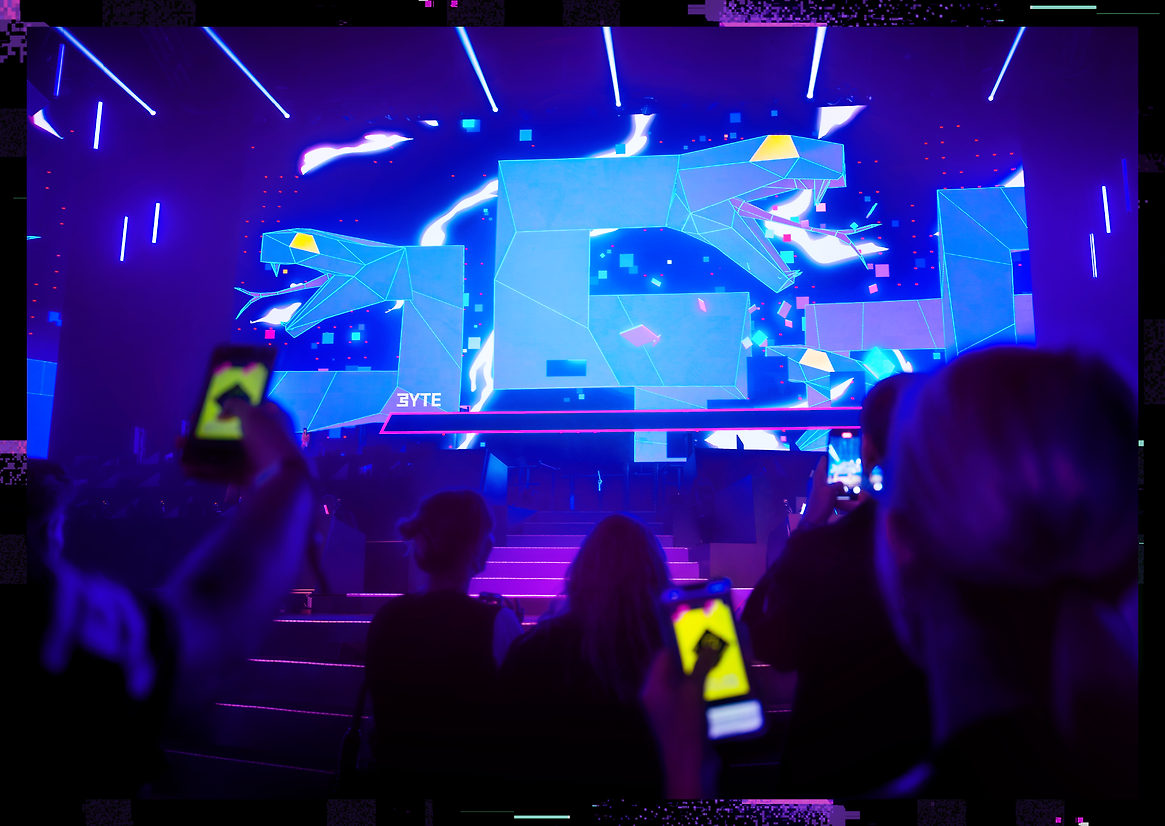 Byte was designed to permeate the entire experience. From custom wristbands that acted as game controllers, to side quests and hidden pieces of concept art, attendees encountered Byte at every turn. The character was brought to life through a bold visual language combining 3D animation and hand-finished 2D elements. A deliberately low-poly aesthetic amplified Byte’s retro roots while anchoring the design in gaming culture. When Byte attacked, screens distorted. When damaged, Byte glitched back into its original, nostalgic form – a nod to early mobile gaming.