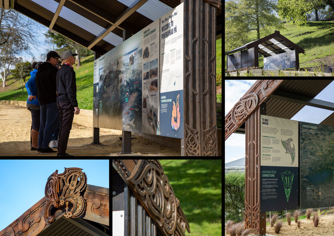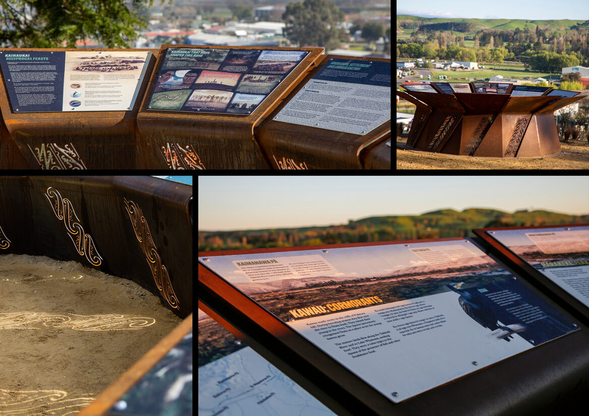 Informed by focus groups with hapū representatives, residents, teachers, highschool students, and prospective visitors, we devised an interconnected suite of installations. This included: interpretive and wayfinding signage, sculptural structures, whakairo (carvings) and other artwork, as well as digital media. These invite visitors and locals to go back in time 400 years, and look at the landscape through a different lens.