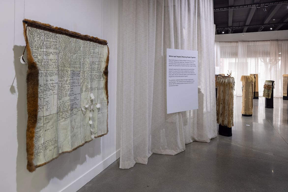 Te Atamira is a multi-purpose arts and cultural space, which opened in the heart of the Whakatipu region in 2022. Te Whare Pora is an exhibition of extraordinary kākahu (cloaks) made by internationally recognised Māori weaver Roka Hurihia Ngarimu-Cameron MNZM, along with hand-made taonga puoro (musical instruments) from Roka’s collection. It is curated by Dr Awhina Tamarapa, Ngāti Kahungunu, Ngāti Ruanui, who is formerly Curator Māori at Te Papa. She is now a Postdoctoral Research Fellow based at the Stout Research Centre, Victoria University of Wellington.