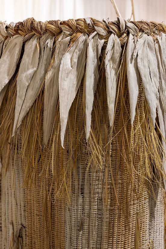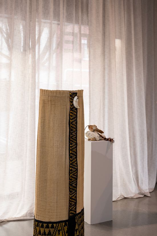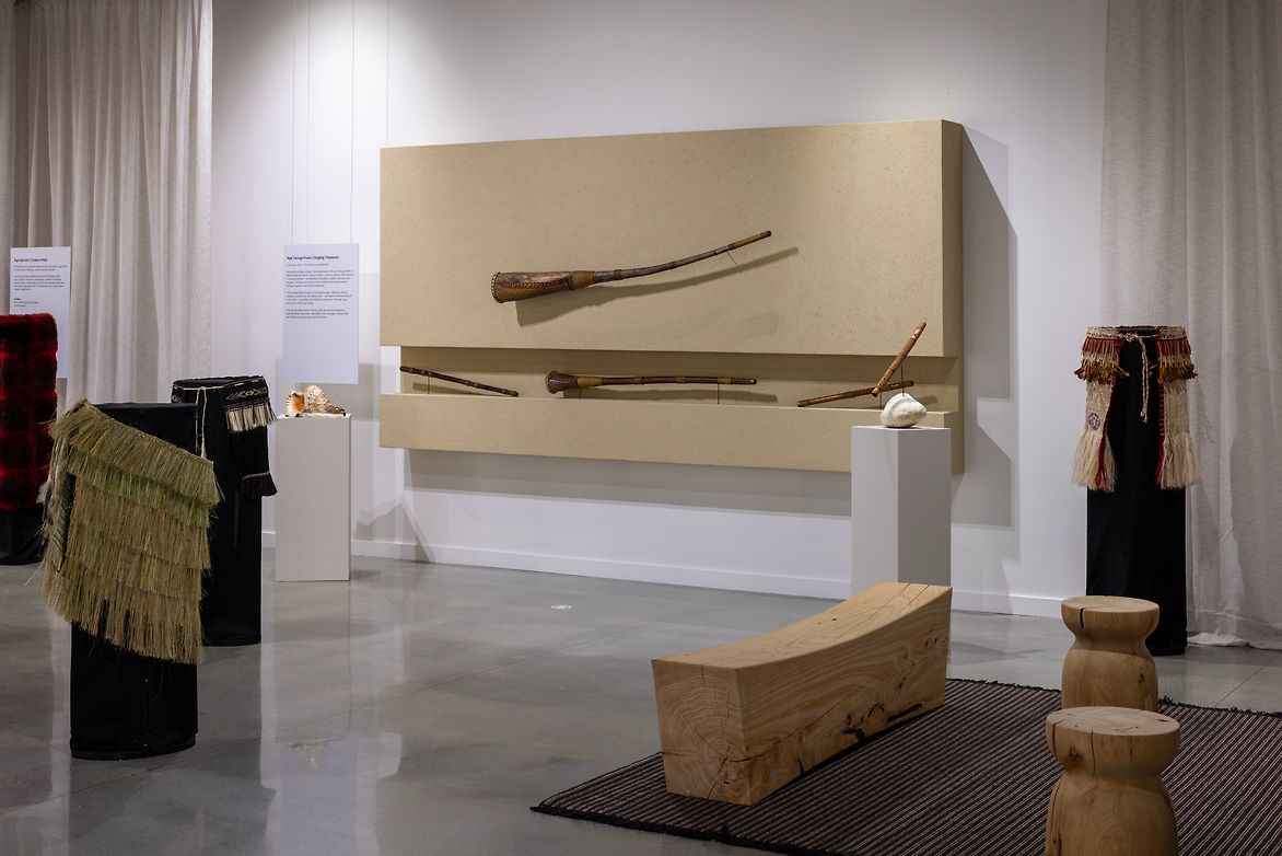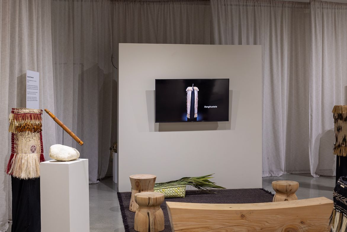 This exhibition design was enabled by the generosity of our friends in the design industry. Treology donated the furniture for the duration of the show, Sto donated the plaster work and CreaturePost created the rock art animation all pro bono. It was evident by the number of people who were prepared to support this exhibition just how much respect there is for Roka Hurihia Kgarimu Cameron MNZM - a hugely influential master weaver.