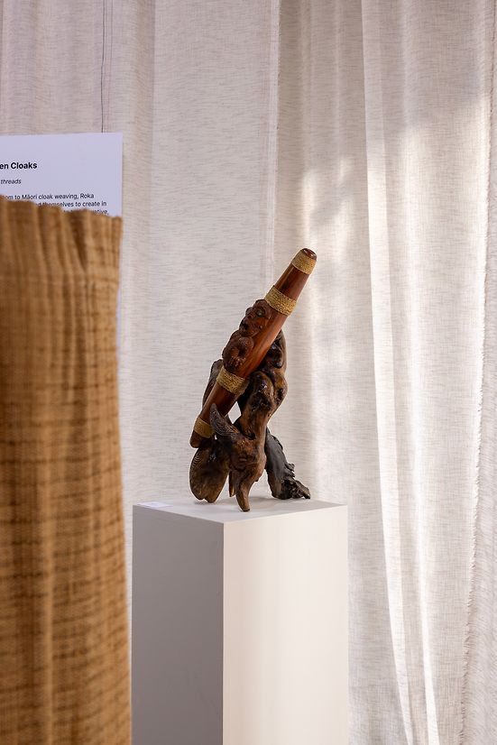We designed recycled kahikatea and rimu stands for the kākahu in acknowledgement of Roka's name. The kākahu were tucked in and out of the openings in the faceted fabric with Roka's work surrounding her students. From the entry all the kākahu are seen together, when closer as curated groups, and when next to them as individuals.