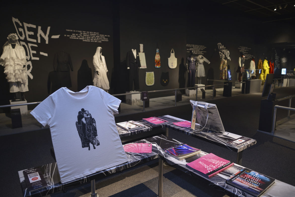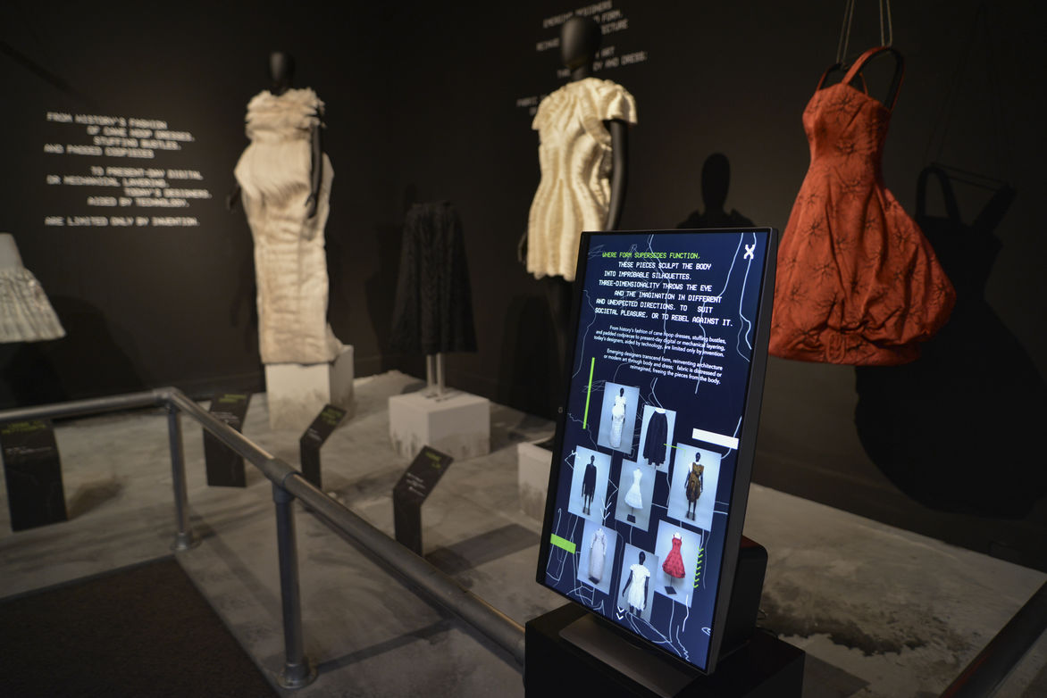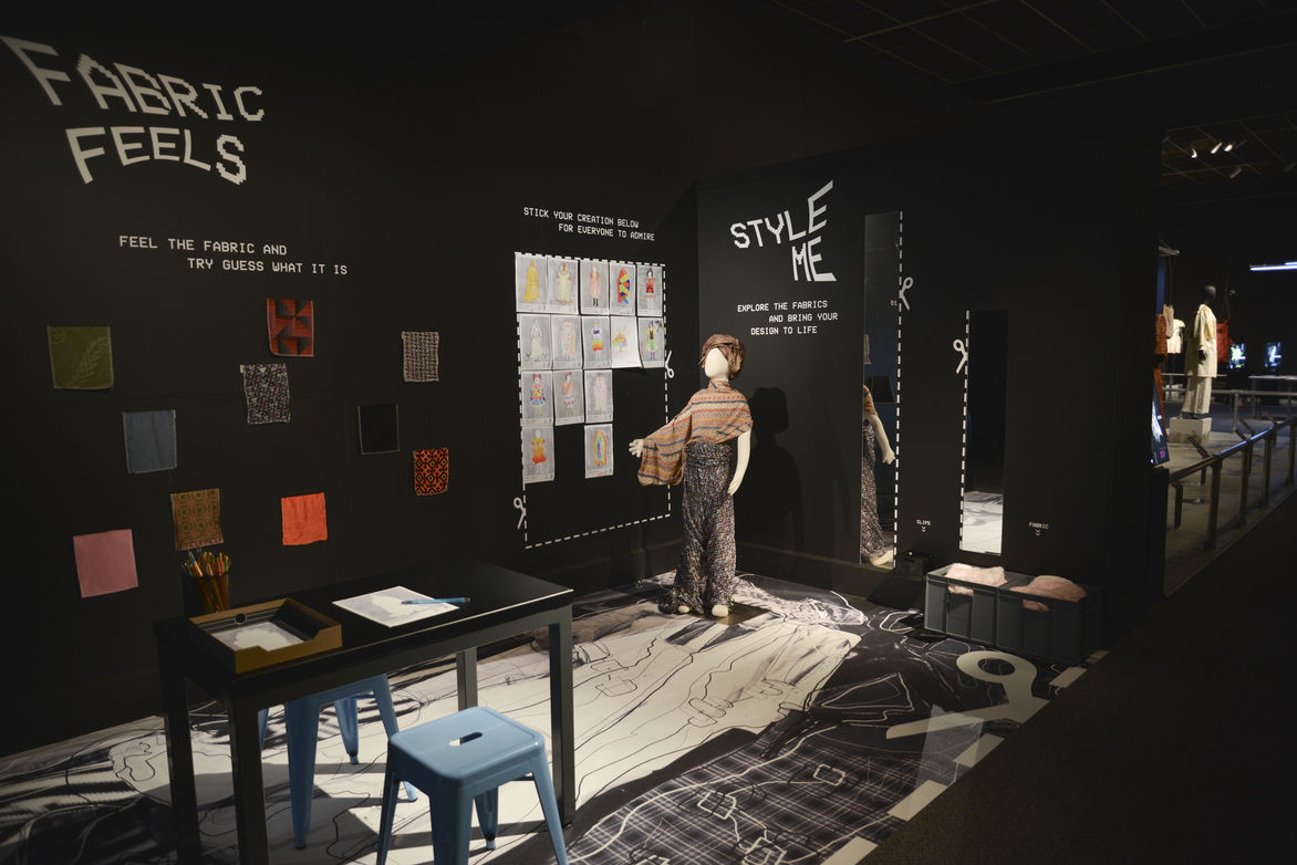 As the exhibition comes to a close, a creative space for families has been incorporated where visitors can get up close and feel fabrics, style their own garment on a mannequin, and express designs on provided silhouettes of featured garments, giving them an alternate reimagining.
