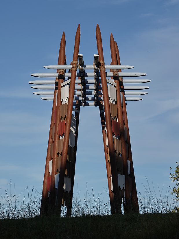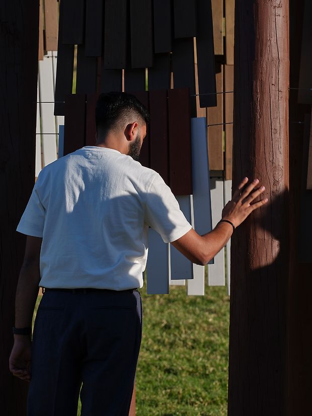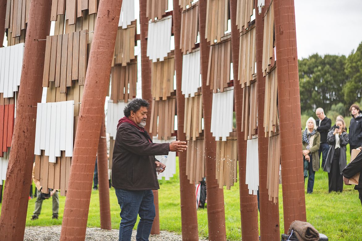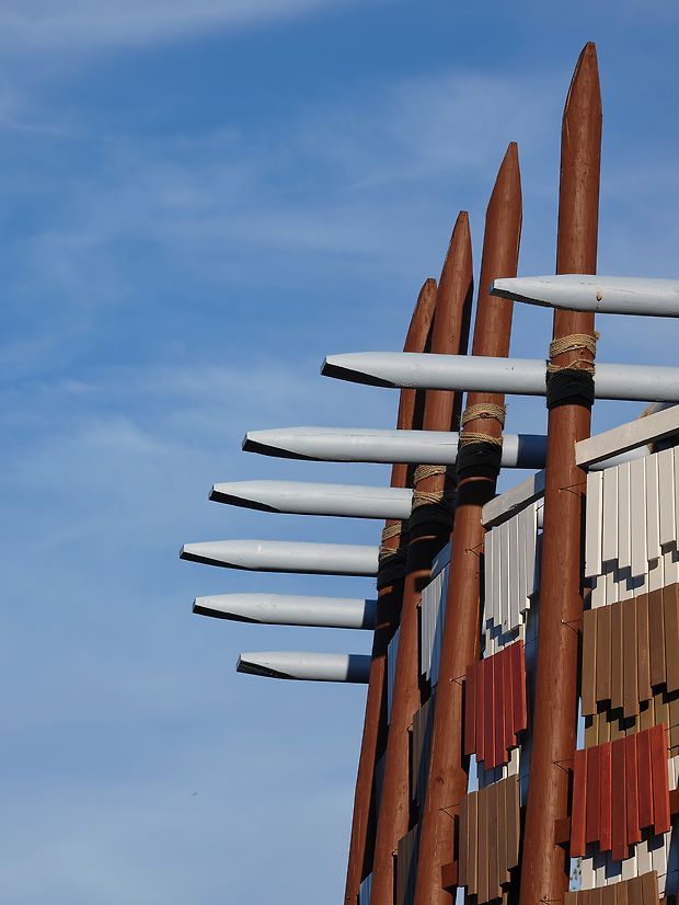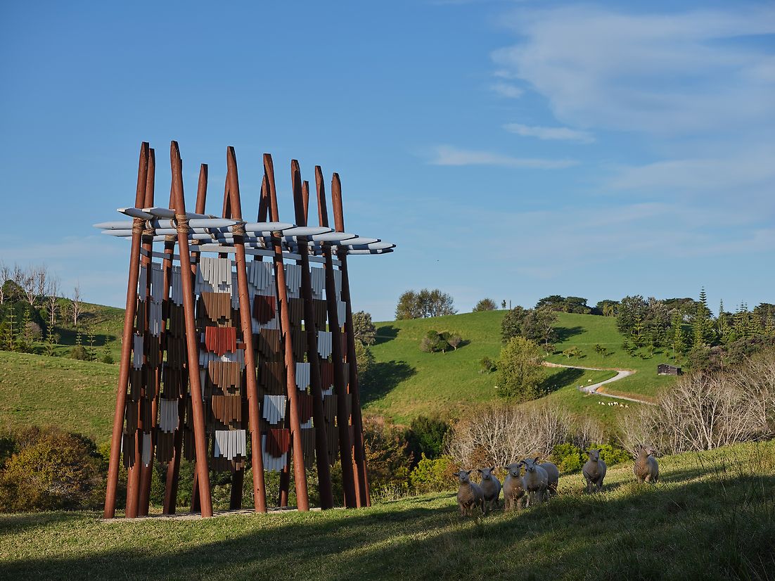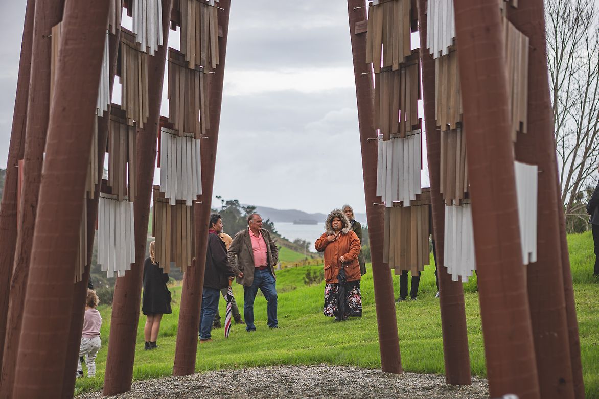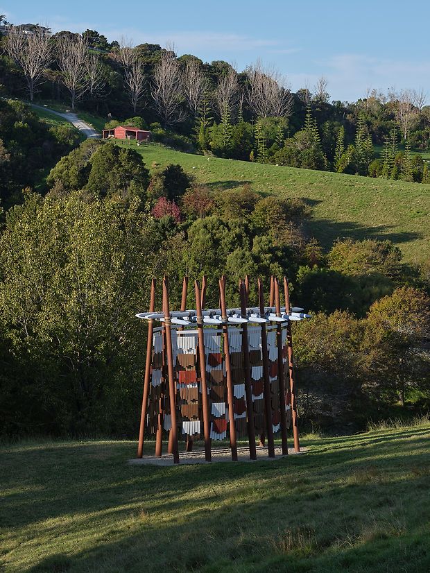 The project's architectural aesthetics are a reflection of vernacular waka construction methods, the structure is draped by a traditional kākahu. When inside the folly, the kākahu wraps the occupants in a bowed oval shaped cloak of manaakitanga. Visitors are invited to pause for a moment, the verticality of the poles draw their eyes upward toward the sisal lashed junctions joining the structure together. The inclined posts frame the view of the sea, the bay in which sits Te Hauturu-o-Toi / Little Barrier Island, the final resting place of the god of wind. The team were gifted this pūrākau (mythological narrative), which was then embodied into architectural form through the unseen forces which act upon the swinging panels. When the wind is stronger, the louder the folly becomes, as panels knock together in orchestral unison.