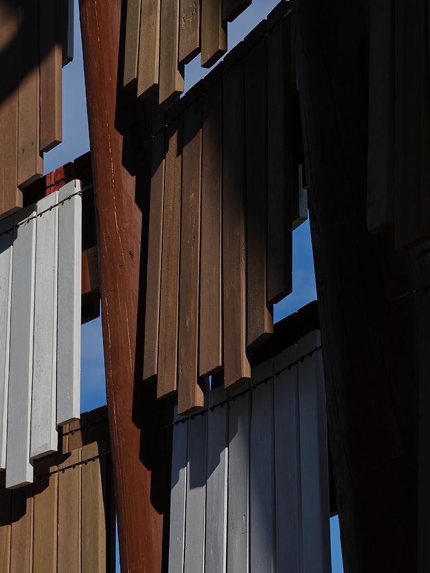 Central to the project is the concept of embodying the kōkōhau (wind's) voice. Through the clever use of tension cables, the decking panels hang freely, creating an interplay of movement in response to the wind. The aim of this was not only to embody the cultural narrative, but to connect those experiencing the folly, to the unseen natural qualities of the site. The use of recycled decking panels as an oversized wind chime adds a touch of whimsy, engaging visitors in an interactive and immersive experience, reviewing how sculptures may often be seen as simply objects in space.