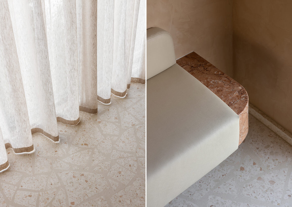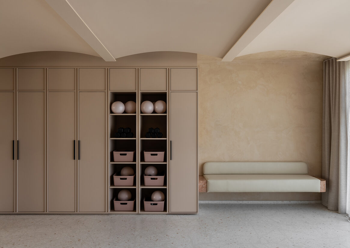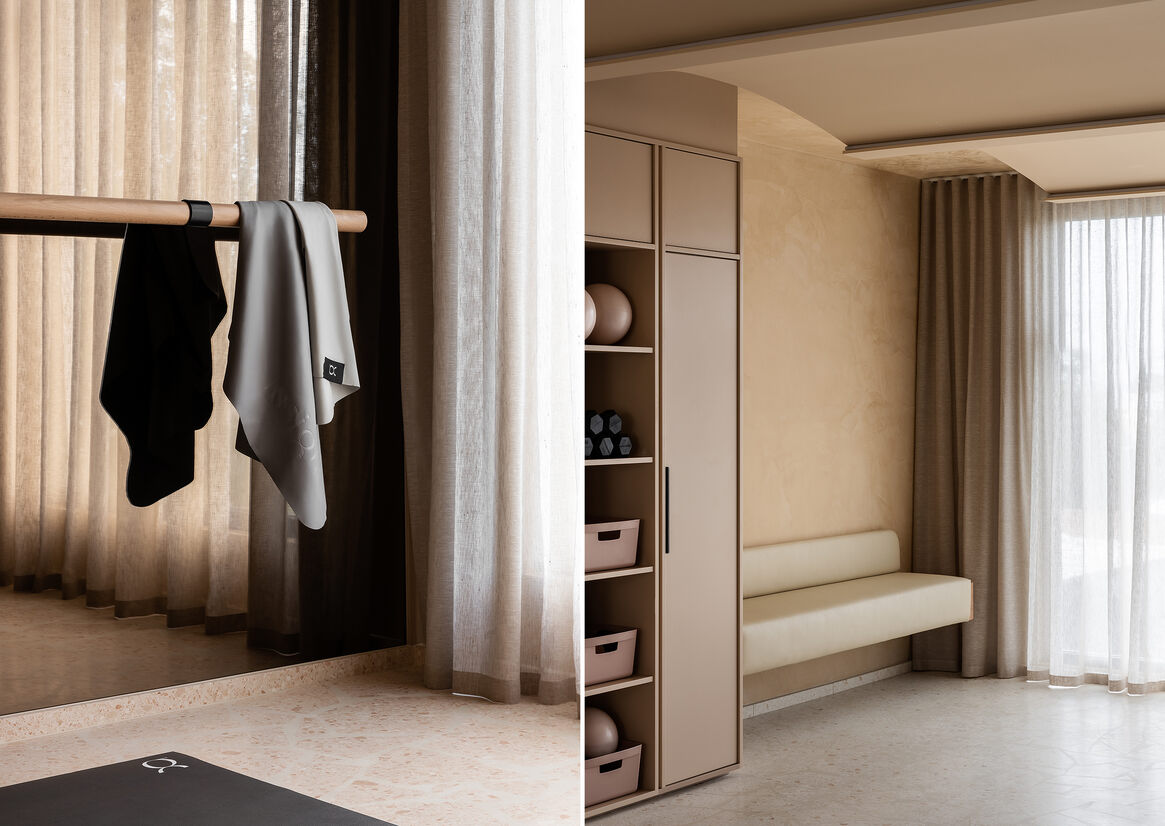 We designed a colour and material narrative to represent the two overlapping elements of the business, and to transition through the three levels, gradually lightening and providing a sensory and tactile experience. The colour palette comprises two distinct yet integrated schemes to represent psychology and movement, respectively. Deep teal tones are professional and earthy to represent the psychology practice on the ground floor, while peach tones of stone, terrazzo and venetian plaster infuse the movement studios with a sense of humanness and serenity. This luxurious materiality provides a boutique feel, steering clear of any clinical connotations.