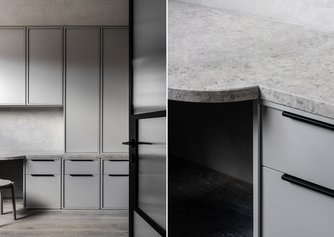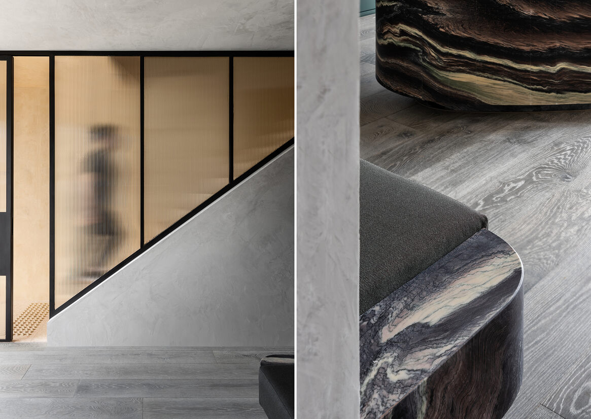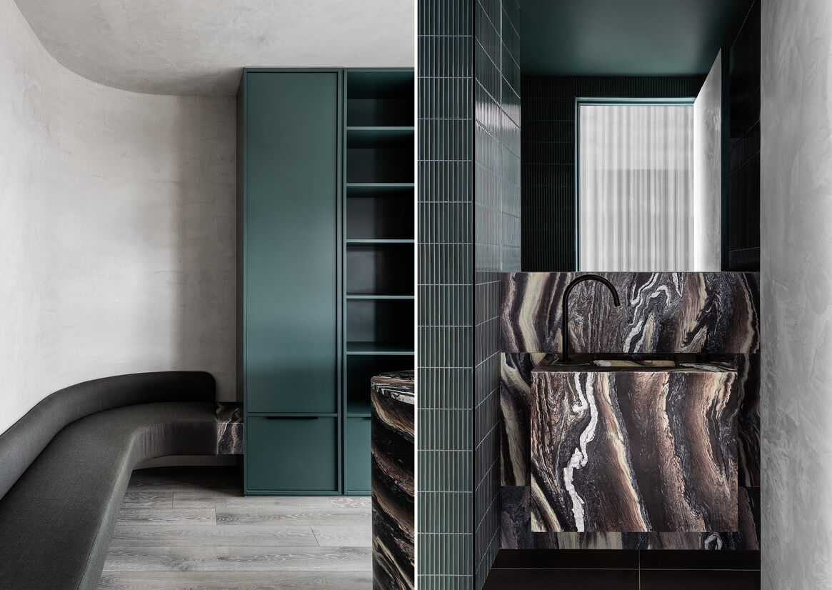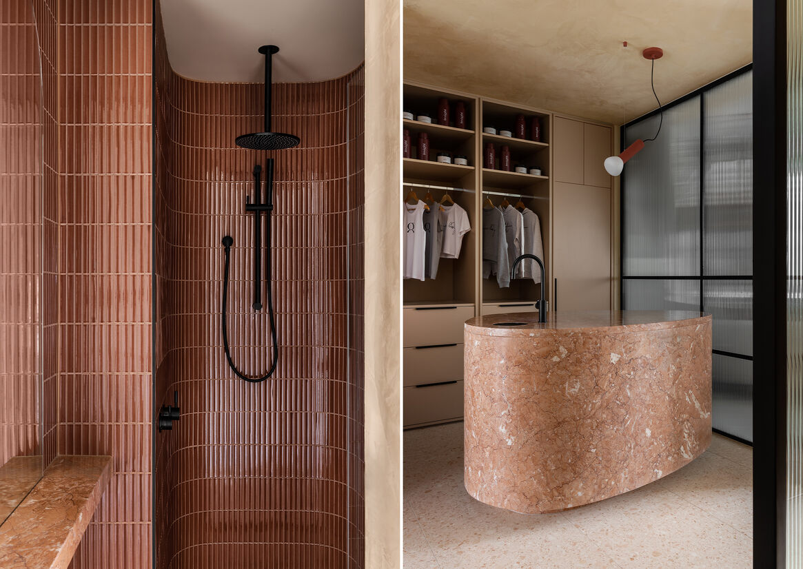 We designed a colour and material narrative to represent the two overlapping elements of the business, and to transition through the three levels, gradually lightening and providing a sensory and tactile experience. The colour palette comprises two distinct yet integrated schemes to represent psychology and movement, respectively. Deep teal tones are professional and earthy to represent the psychology practice on the ground floor, while peach tones of stone, terrazzo and venetian plaster infuse the movement studios with a sense of humanness and serenity. This luxurious materiality provides a boutique feel, steering clear of any clinical connotations.