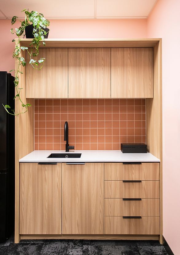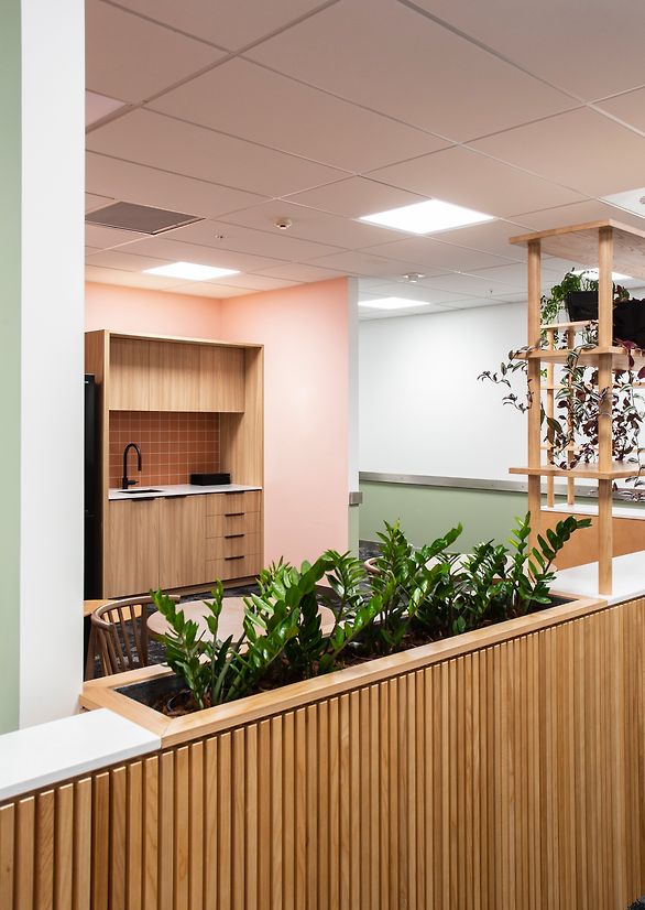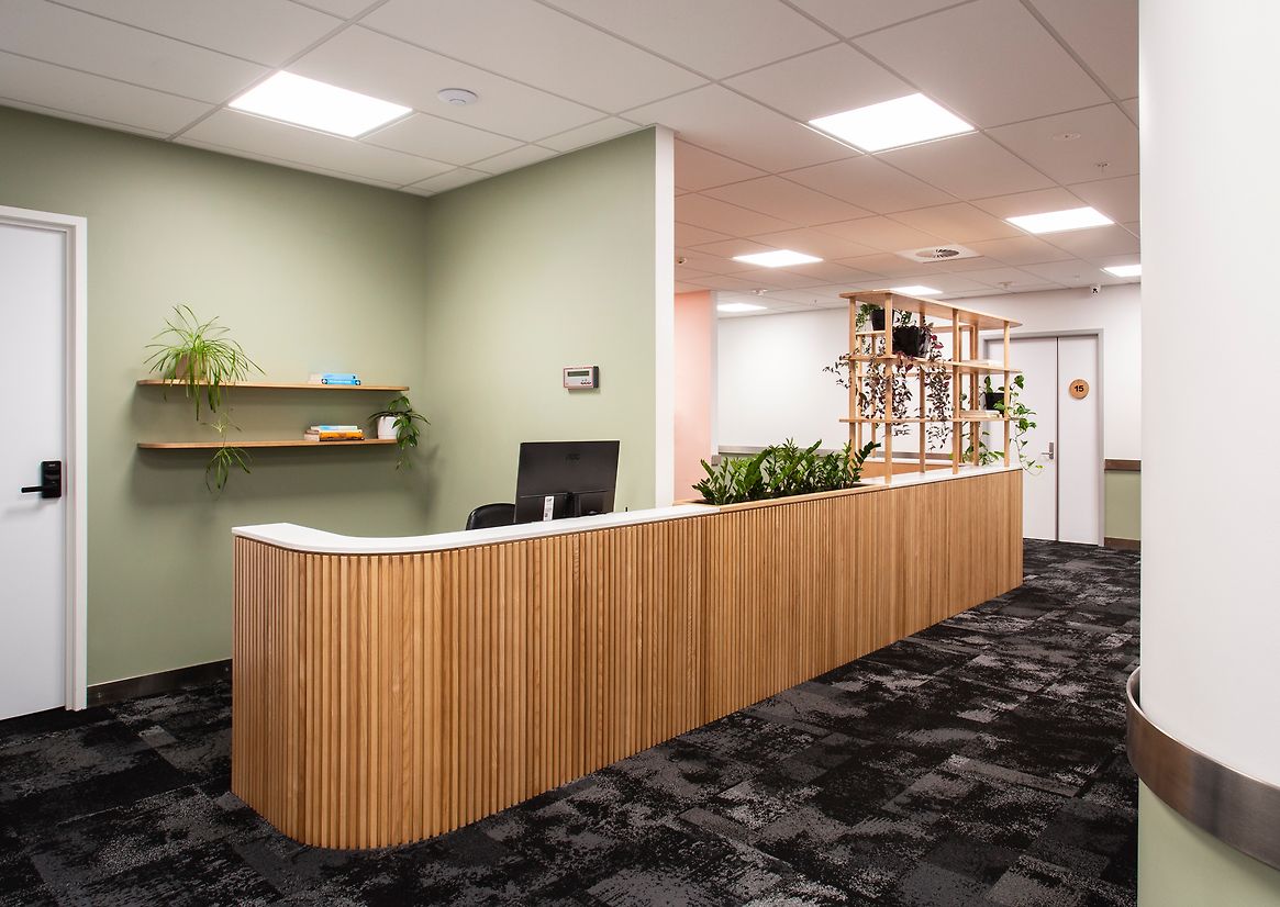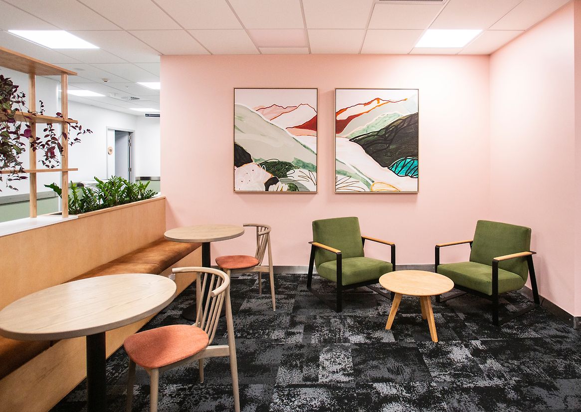 The material palette is unexpected in a healthcare setting, utilising colour psychology and biophilic considerations to create a wellness-oriented space. Calming pinks and rejuvenating greens envelop the patient lounge and adjacent nurses’ station while timber furniture, softened shapes and air-purifying indoor plants increase parasympathetic activity, calming the nerves of patients, visitors and staff.