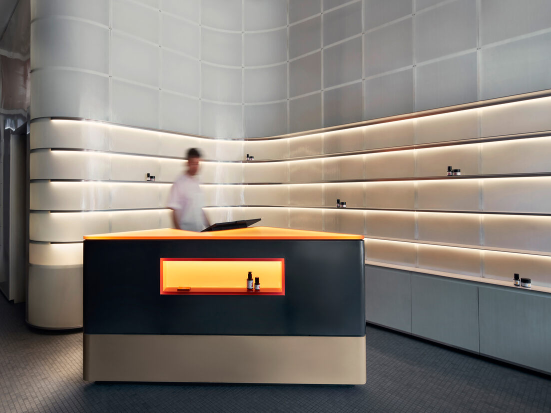 The self and the body are referenced throughout the interior. The reception and retail space (renamed ‘concierge’) is defined by a curved wall clad in a translucent fibreglass skin. Brushed aluminium blades form shelves, sitting atop like a delicate bone structure, and gently curving behind a glowing counter that draws the eye and warmly anchors the space. Polished finishes — including mixed metals and remarkably-veined natural stone — represent surface and metamorphic change, while glass mosaic floor tiles and verdant greenery evoke cellular rejuvenation.
