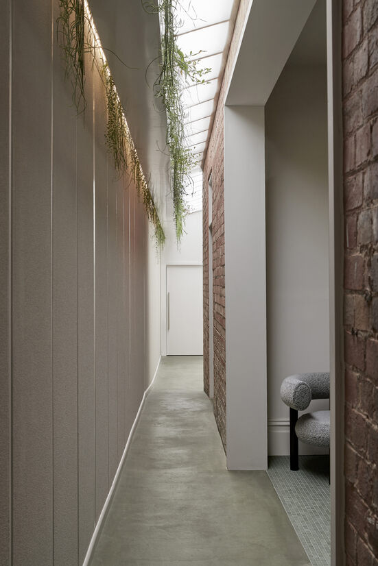 Special rear and side extensions on the ground floor proved crucial to the functioning of the space, providing an opportunity to bring in natural light. Indoor planting was introduced through a suspended arbour, running the full length of the now enclosed lightwell corridor. A new punctuation takes advantage of this vista, allowing clients to await their consultations in the centrally-located decompression lounge – a luxurious re-envisioning of the ubiquitous waiting room, now with enhanced natural daylight, designer furnishings, soft textiles and a lustrous, custom-designed houndstooth rug.