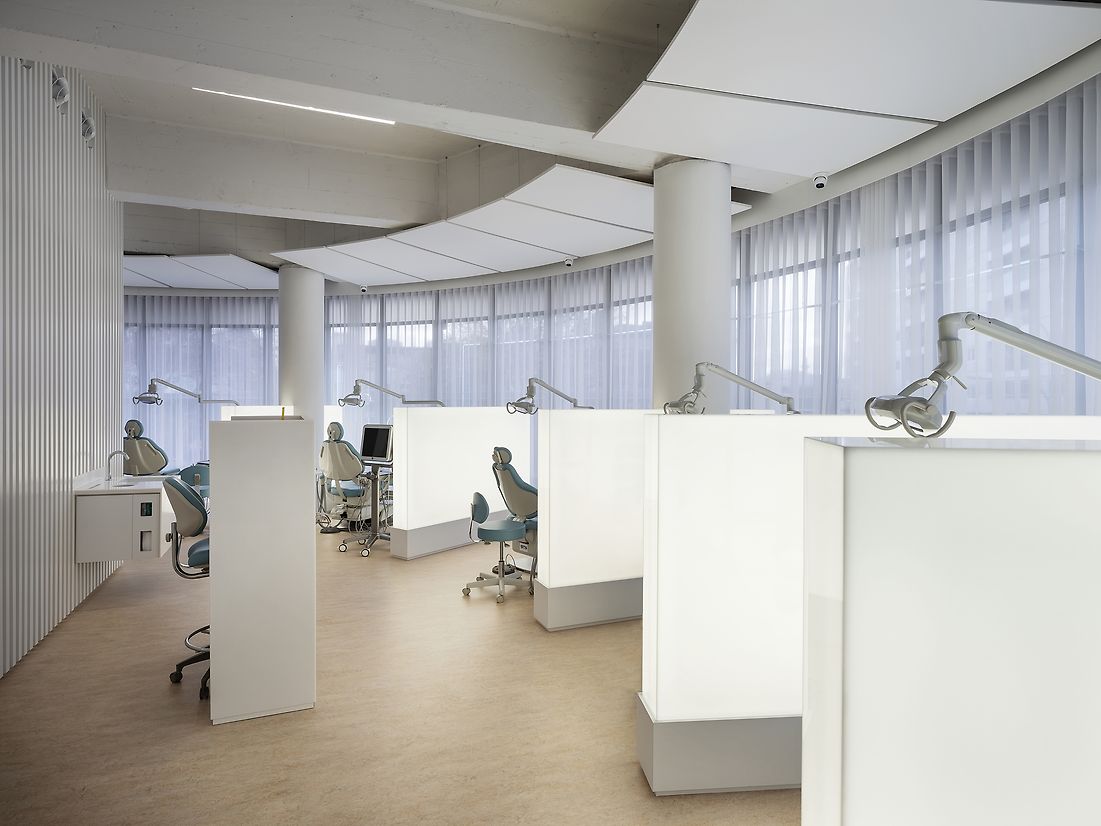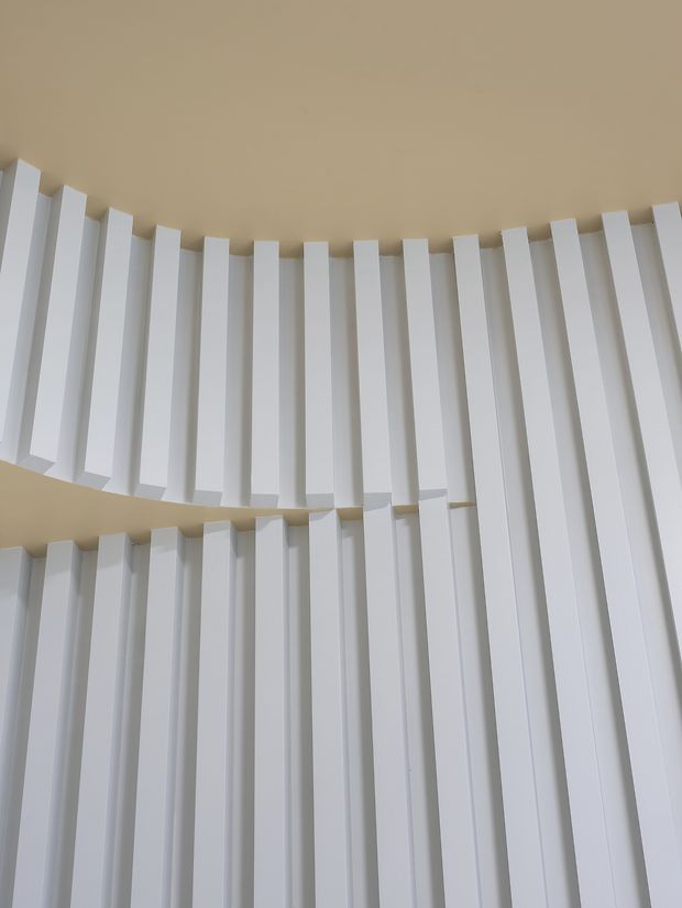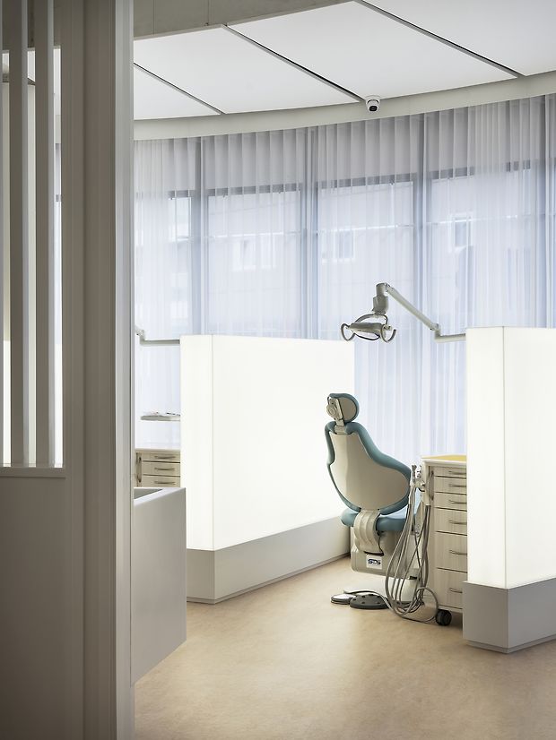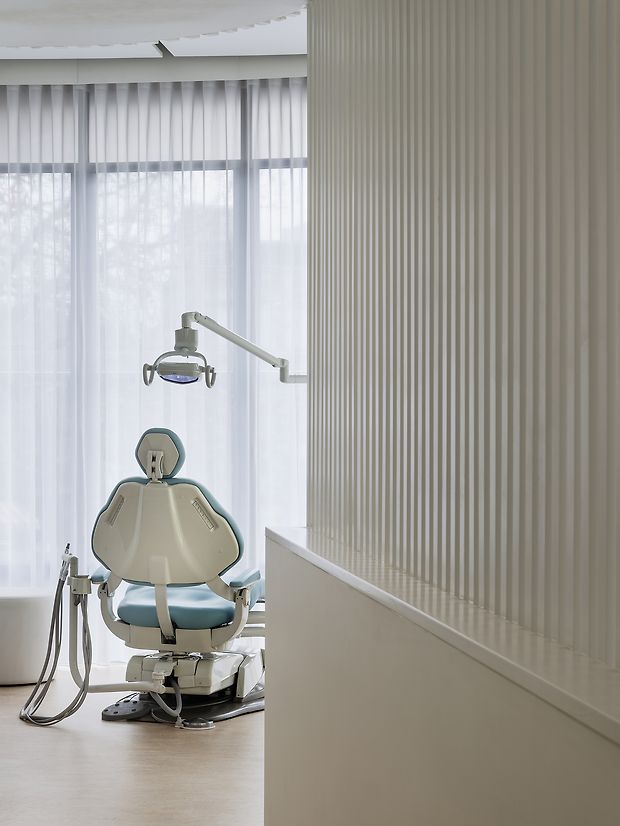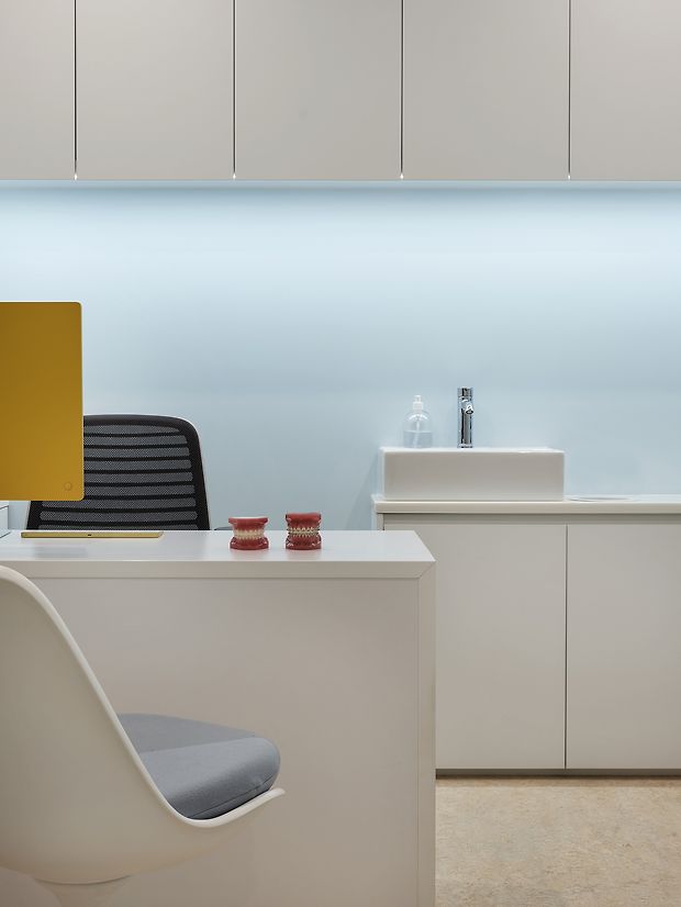 The entire treatment space is envisaged as an open mouth, acoustic panels suspended from the ceiling provide necessary sound buffering, while their form is crafted to resemble teeth, further referenced by the glowing white light boxes. White vertical battens wrap around the walls, creating a screen for the sterilisation work area. The orthodontic equipment is shielded between the light boxes, and soft sheer white curtains cover the glass frontage, providing privacy while allowing in diffused natural light. Natural light is harnessed to evoke an emotive response of calm and wellness and was prioritised in the design. The neon signage at the front of the clinic was continued across the glass frontage, a nod towards braces and the high-tech nature of orthodontic practice and research.