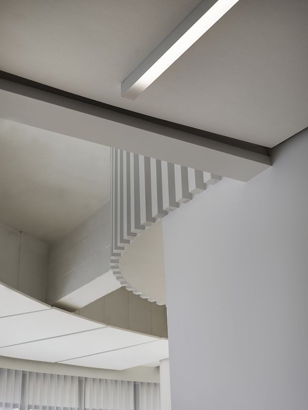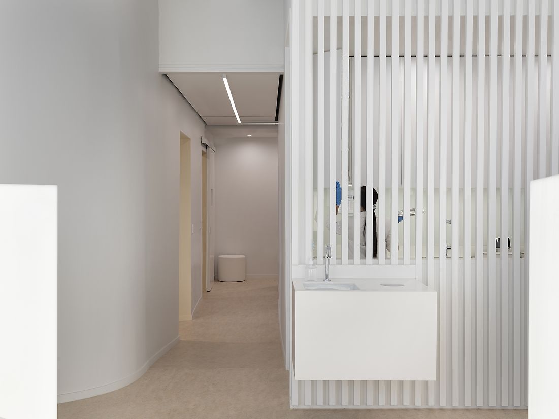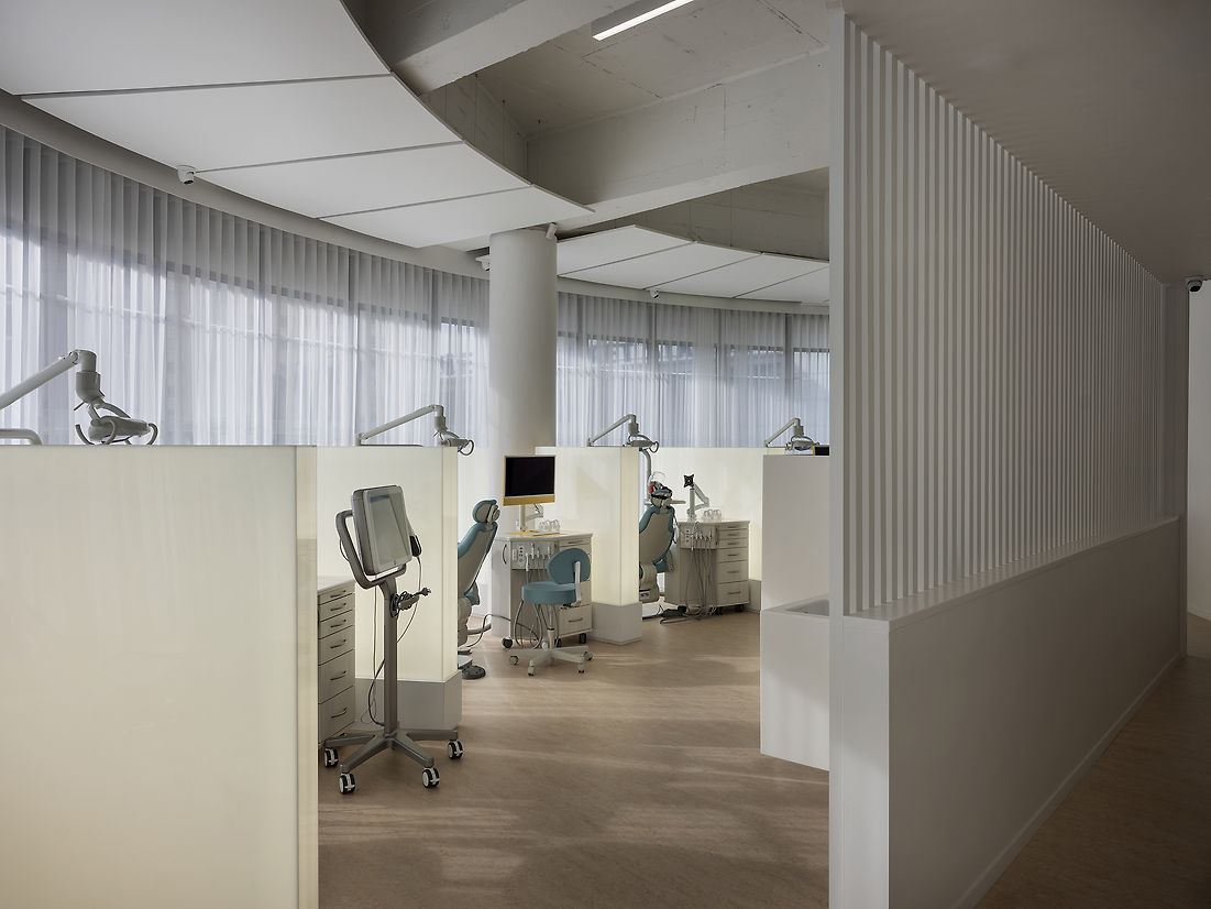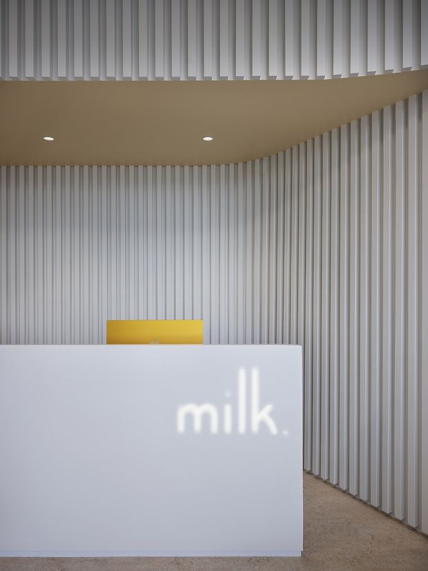 The client had leased a space for their expanding Orthodontic business in Newmarket, Auckland and was seeking to create an aesthetic for their new clinic that stretched beyond conventional ideas for Orthodontic clinical care. Our response was to design a space with ‘tongue and cheek’ like references to the practises and materials used for orthodontic care. The reception walls softly curve and are encased in floor to ceiling white battens, imitating the linear striations of a toothbrush. The clinical ‘white’ associated with dentistry is softened, the front desk is porcelain-like yet is also softened through the glowing practice signage that emits from within the stone. Bright yellow accents from the desktop computers add dynamism. The striated battens and yellow tech-hardware appear consistently throughout the design, from the reception through to the consultation and treatment areas. The openness of the treatment space is an unusual layout for an orthodontic clinic in New Zealand, yet serves to strip away anxiety and normalise the process of receiving treatment. The entire treatment space is envisaged as an open mouth, acoustic panels suspended from the ceiling provide necessary sound buffering, while their form is crafted to resemble teeth, further referenced by the glowing white light boxes. White vertical battens wrap around the walls, creating a screen for the sterilisation work area. The orthodontic equipment is shielded between the light boxes, and soft sheer white curtains cover the glass frontage, providing privacy while allowing in diffused natural light. Natural light is harnessed to evoke an emotive response of calm and wellness and was prioritised in the design. The neon signage at the front of the clinic was continued across the glass frontage, a nod towards braces and the high-tech nature of orthodontic practice and research. The sleek and playful design for the clinic serves to testify and reaffirm Milk Orthodontics as an innovative and leading practice for orthodontic care, providing current state-of-the-art treatments in a unique yet comfortable environment.