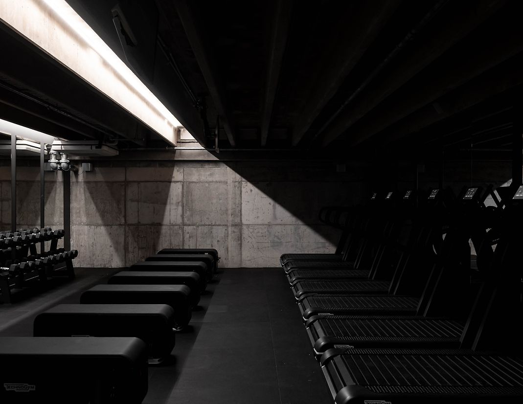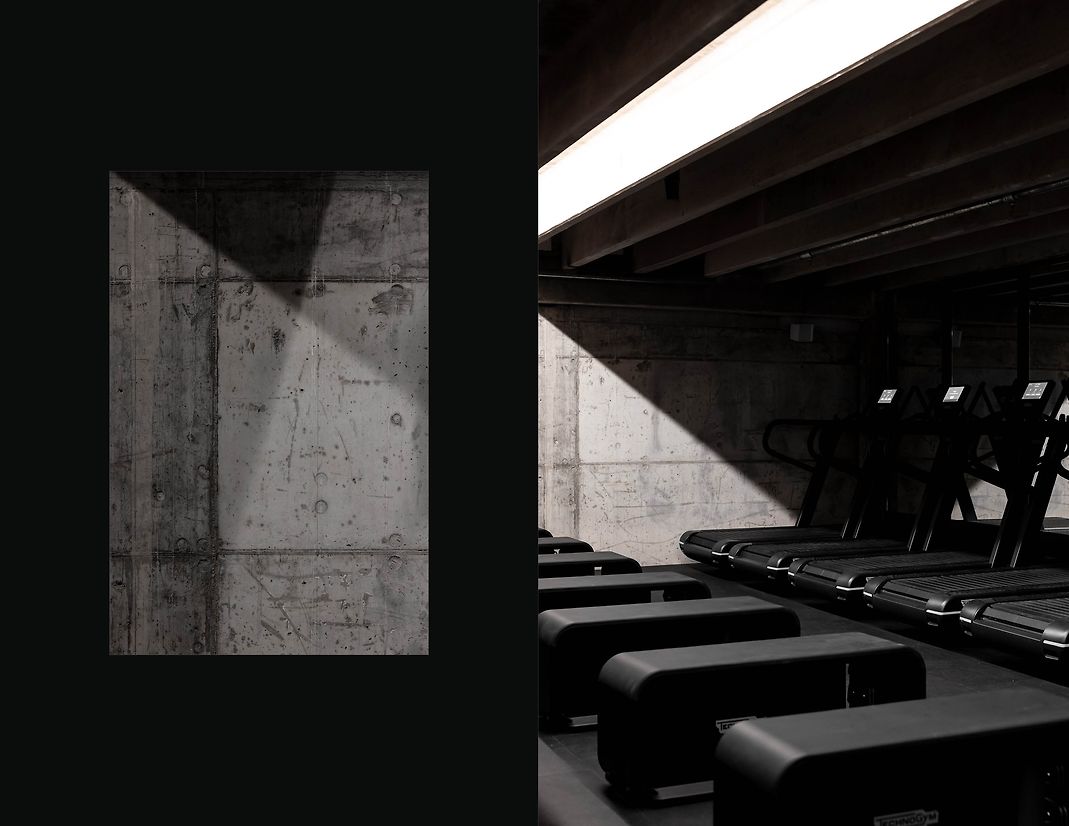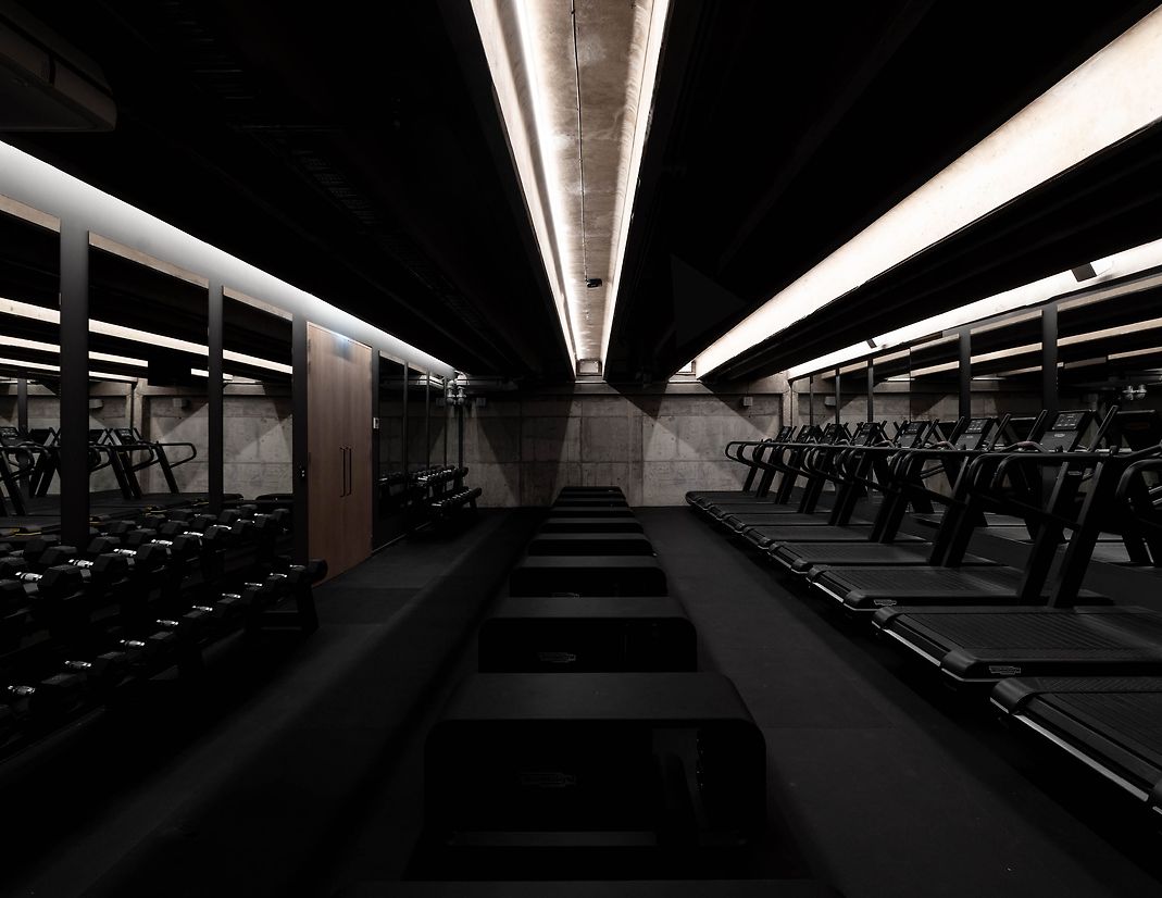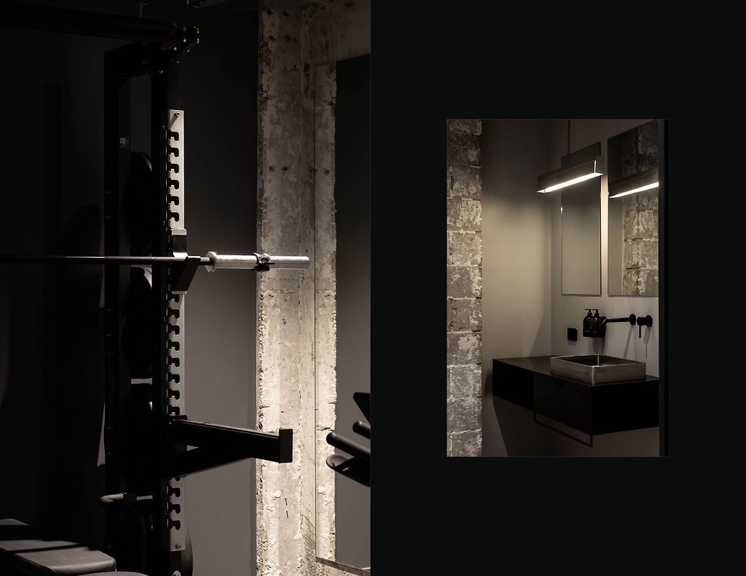 Within the gym, original concrete structure is left untouched, still bearing the pencil-marks of trades through years of construction. Harsh angled lighting ensures light only splashes where it is necessary, creating space to hide when most vulnerable.
