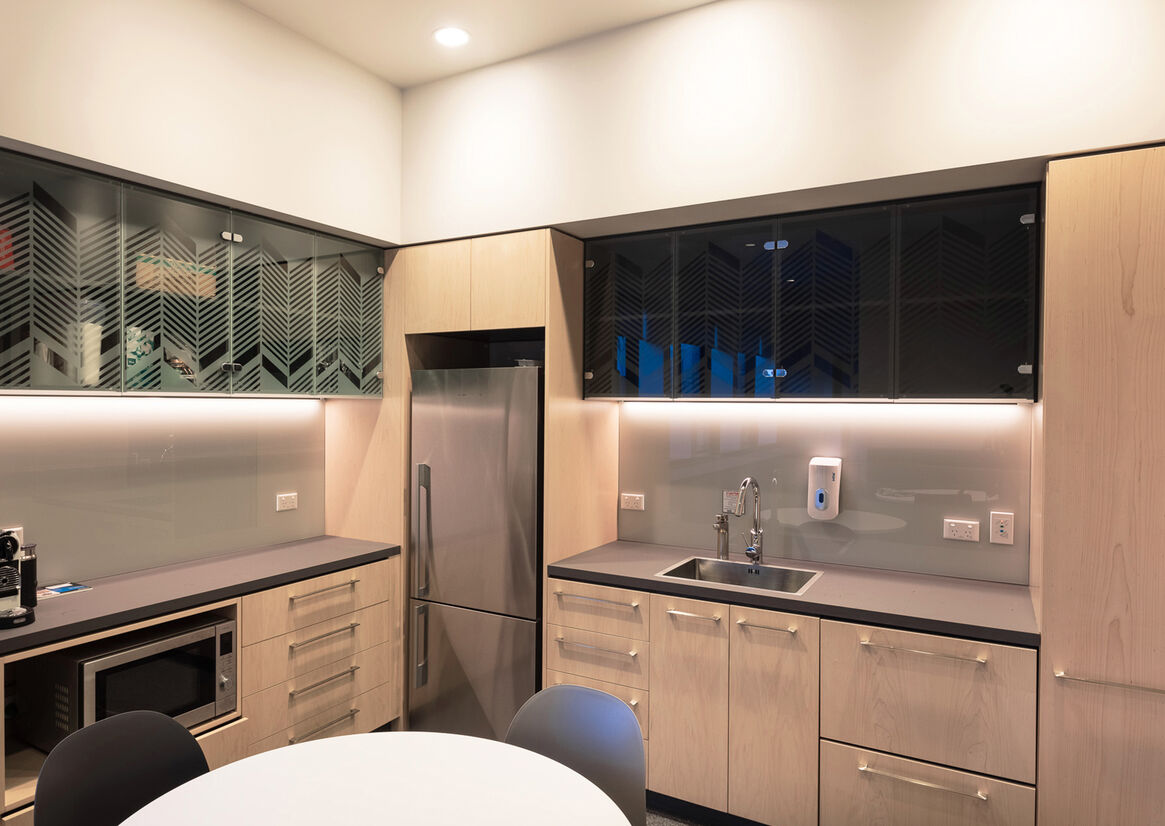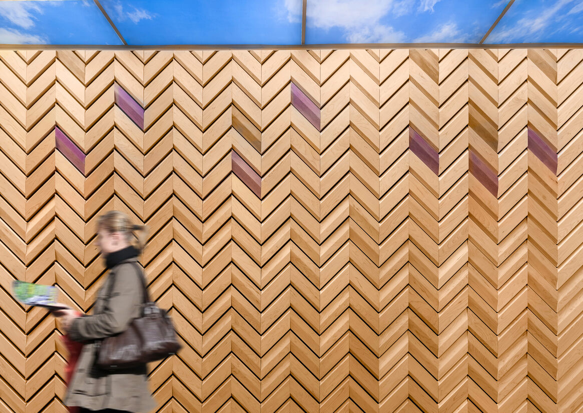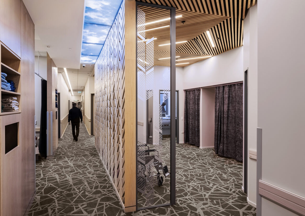 The patient waiting spaces are visually interesting and engaging, whilst calming and light in what was originally a confined underground space. Design concepts for the wood panelling and other iconography were inspired from the local Maori artists as well as a sense of NZ, Pacific and Wellington iconography, playing on woven forms and the wind and waves of the harbour city. Both the feature timber walls and ceiling elements along with backlit wall and ceiling picture panels (which also engage with local and regional imagery) catch the eye and provide distraction and visual relief within a tenancy some 2m below ground level, to the otherwise concerned patients and family. Full height quiet stud, acoustic batts, and noise line gib provide essential privacy along with challenges in a crowded ceiling space.