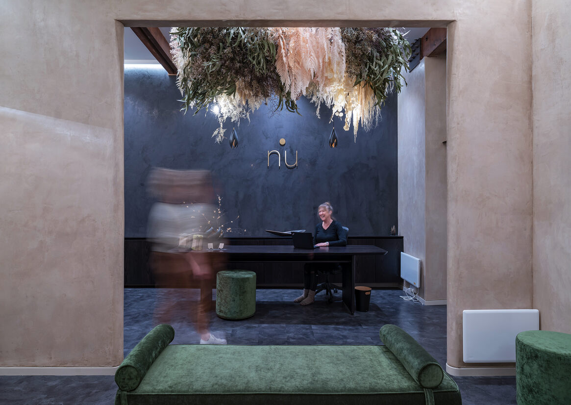 Nu yoga studio was born through the idea that rest, breath and movement need to be an everyday tool for modern society, a tool for one’s wellbeing and longevity. Located in the warehouse precinct of Dunedin, nu yoga studio’s reviving character is an amalgamation of old and new. The front door welcomes you with an ebony-stained solid wood door showcasing the brass yin yang aesthetics of the studio branding, accompanied by a roughly cast Nikau leaf door handle, referencing nature and its grounding properties. The handle’s polished high point’s link to the brass materiality of the branding. Light-reflecting plastered walls entice you towards an oversized reception table that mirrors the appearance of the front door and the custom cabinetry throughout the lounge and changing rooms. The artisanally crafted objects that catch your attention throughout the studio are clad in rich matte black and copper lustre glazes to cast a contrast with the original heritage stone and red bricks. The lounge space creates a place to connect with others, with the use of eucalyptus green velvet daybeds and ottomans, counterbalancing the moody black and copper pendants and recessed ceiling lighting, altering the atmosphere throughout the course of the day. The original kauri floors, red brick walls and mudstone blocks of the yoga studio still remain and with the use of Resene’s Marrakesh plaster and a wax finish, this space becomes a much-needed oasis for everyday practice. As the studio fills with students for early sun salutations, the energy of the people and a sense of place is entirely what this space was created for.
